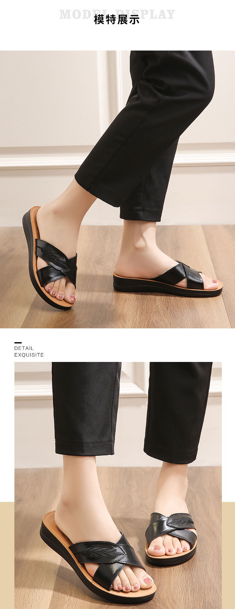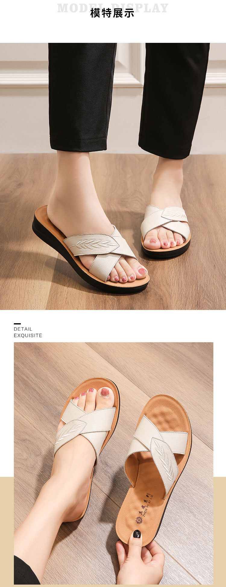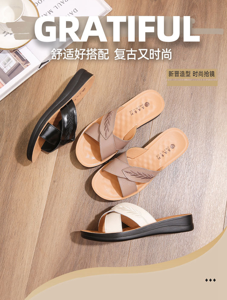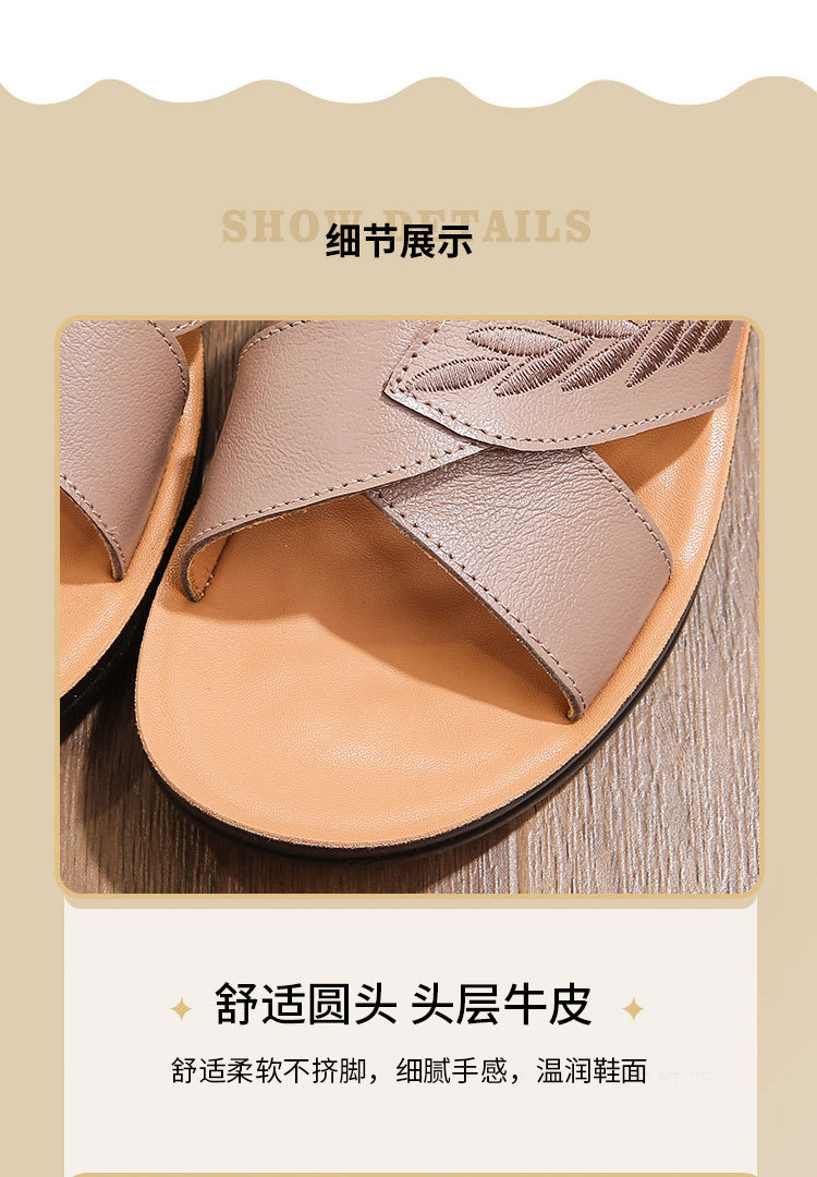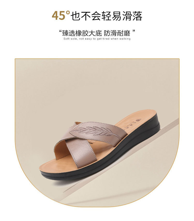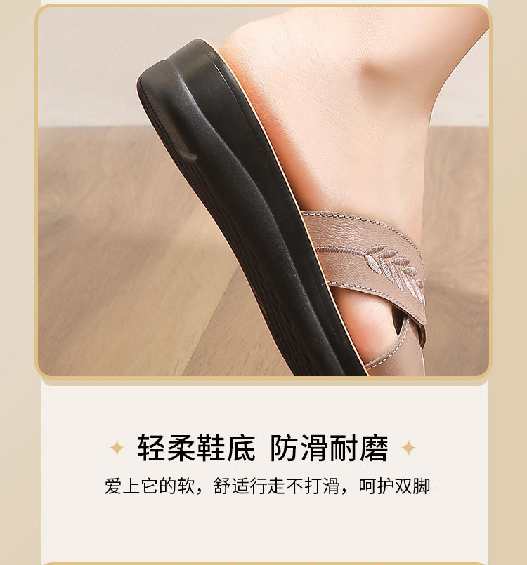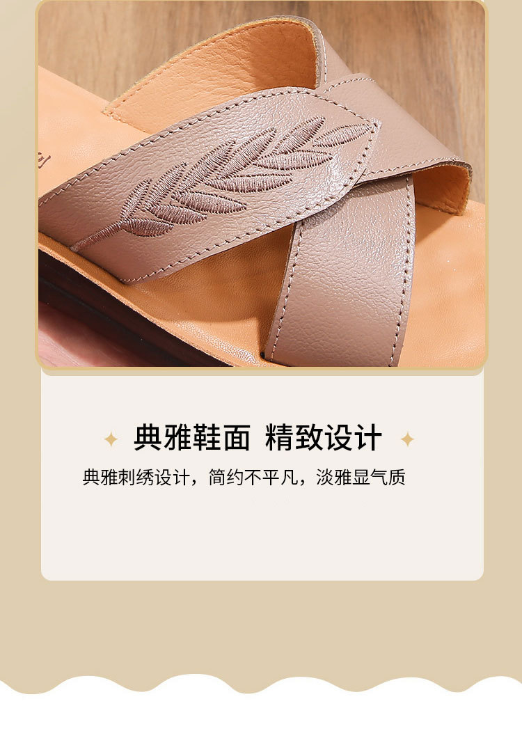 Choice In-Stock Genuine Leather Mom Slippers for Women, Middle-Aged, Non-Slip, Embroidered, Thick-Soled, Comfortable for Elderly, Flat Sole