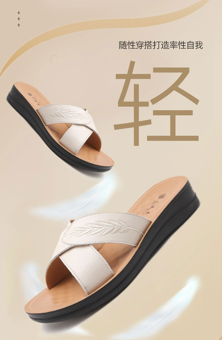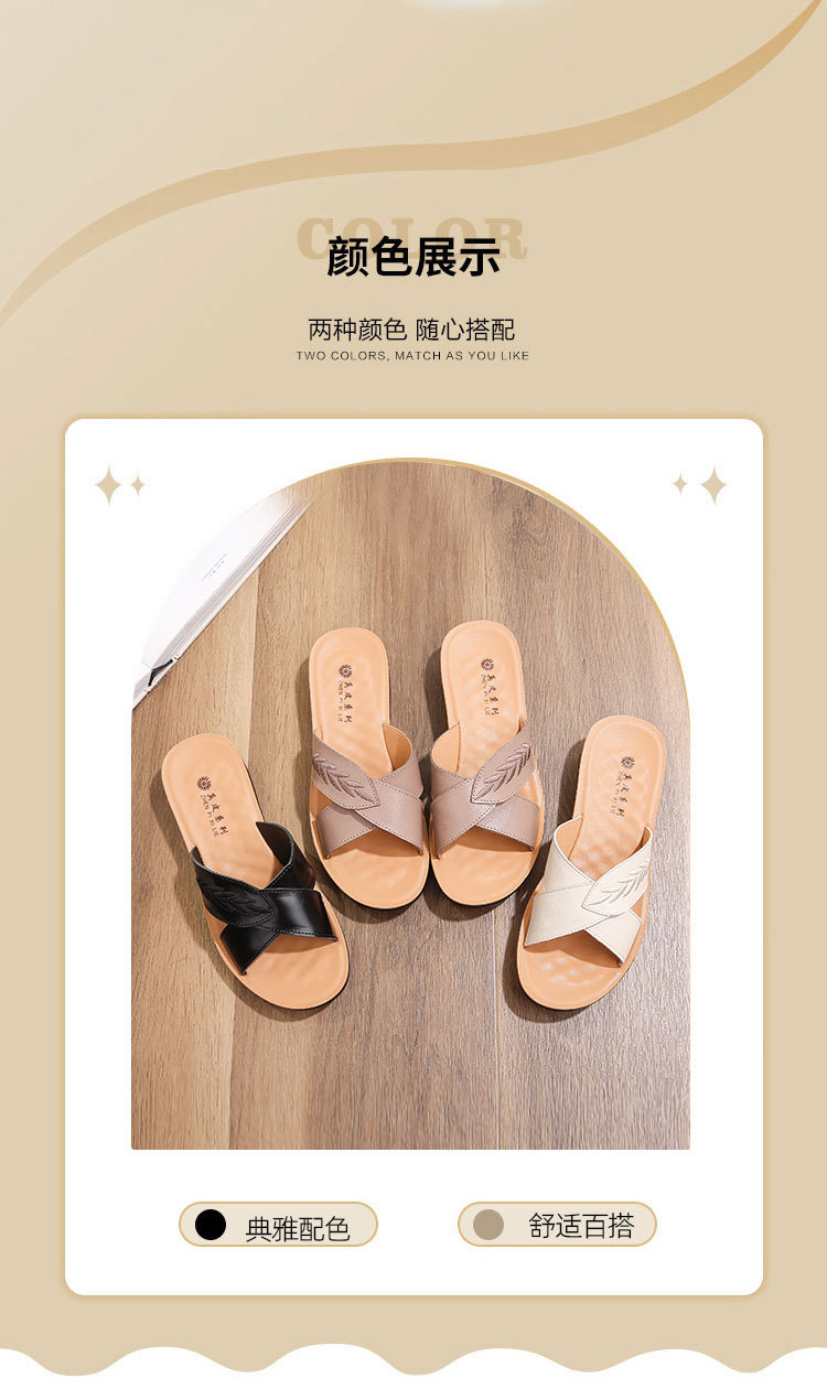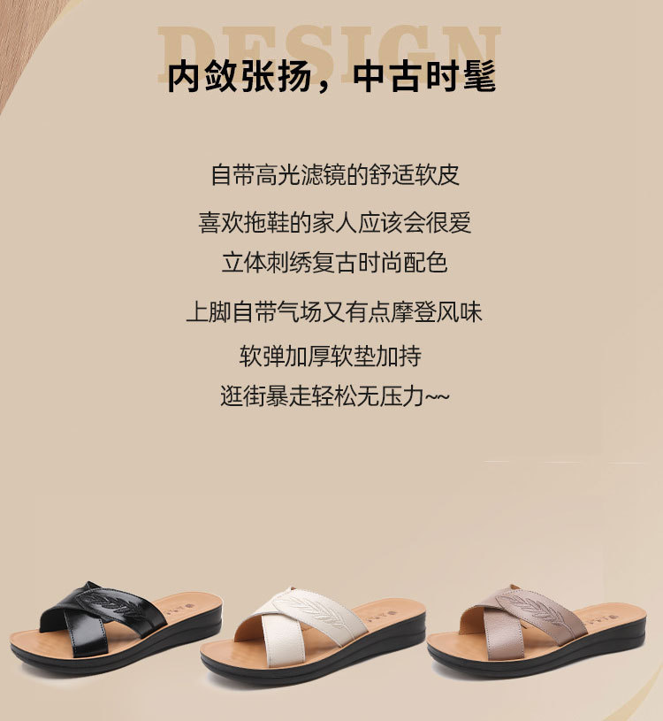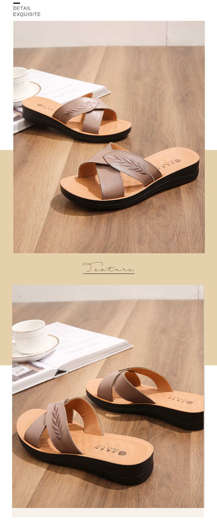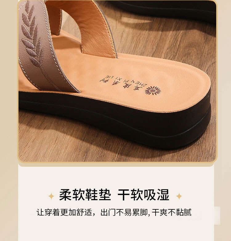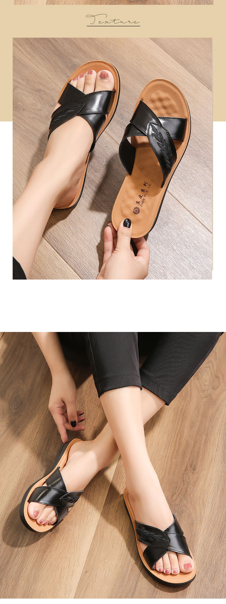Choice In-Stock Genuine Leather Mom Slippers for Women, Middle-Aged, Non-Slip, Embroidered, Thick-Soled, Comfortable for Elderly, Flat Sole