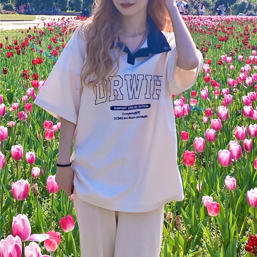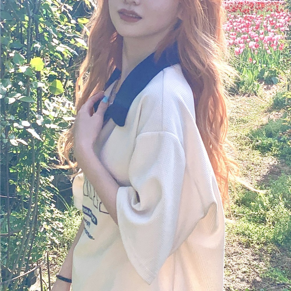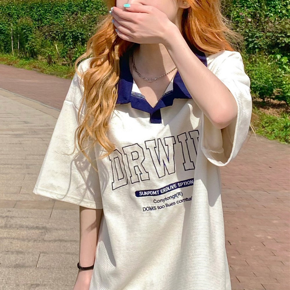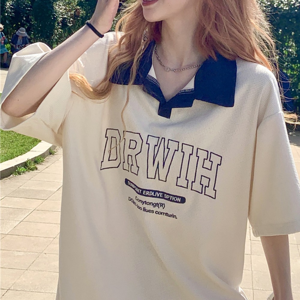 American Retro Shoulder Short-sleeved T-shirt Women's Wafflick Design Sense Niche Polo Shirt College Style Loose Top Trendy