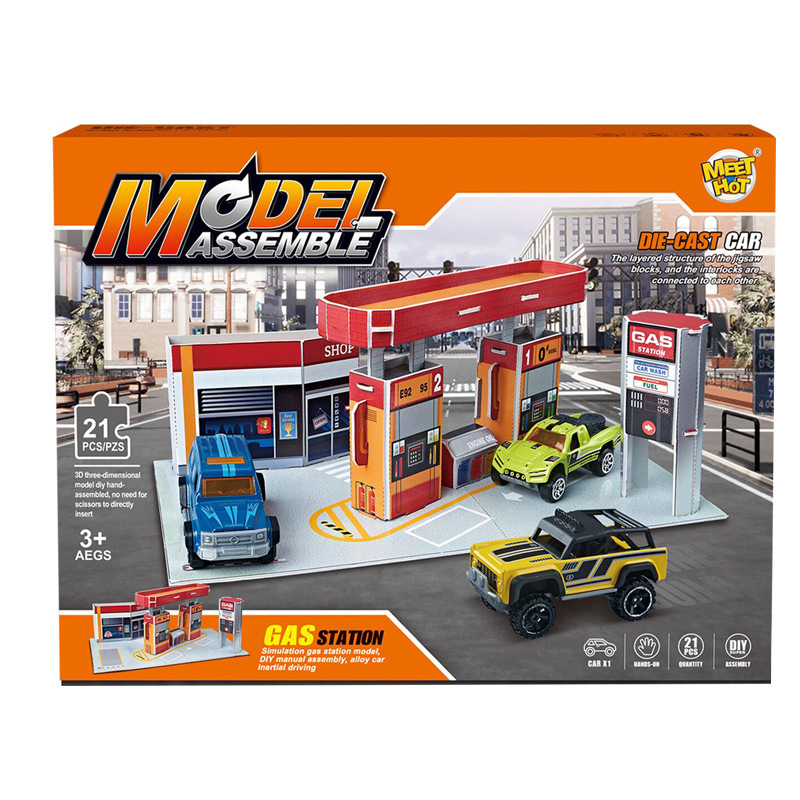 Color: City gas station three-dimensional puzzle scene with 1 alloy car