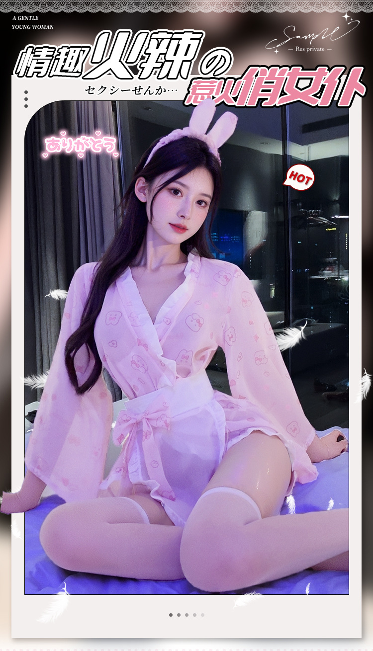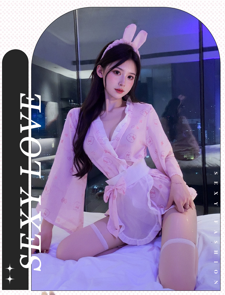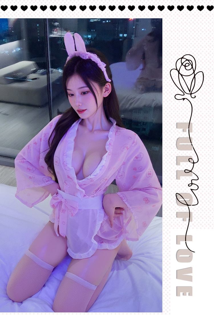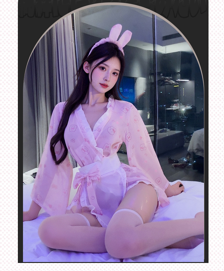 Sexy Lingerie Bunny Maid Uniform Japanese Cute Pure Desire Print Kimono Nightgown Bowknot Sleep Dress Bunny Girl