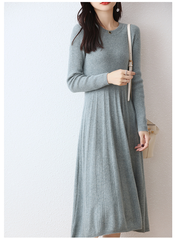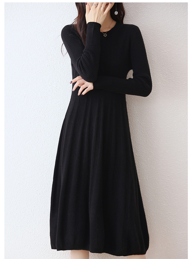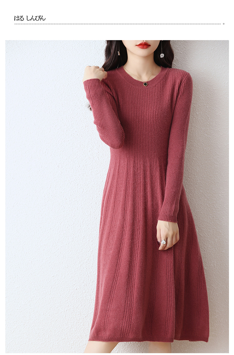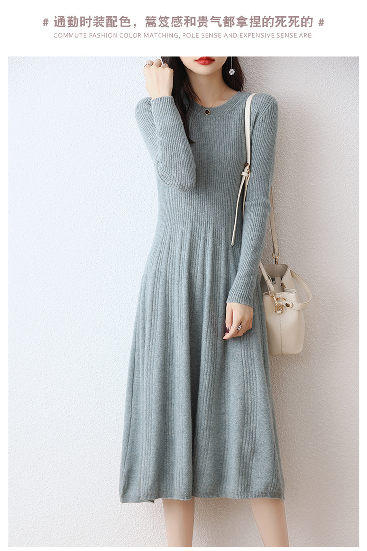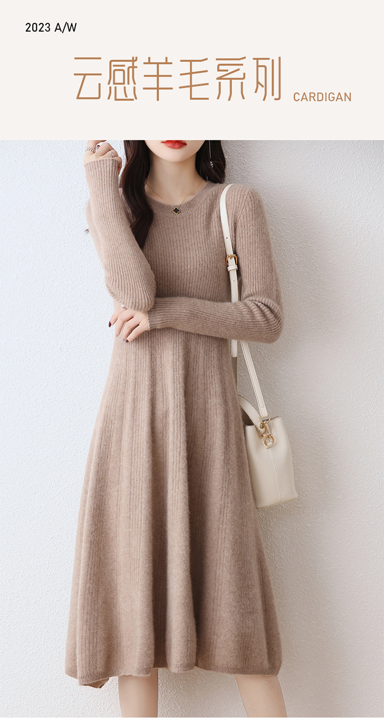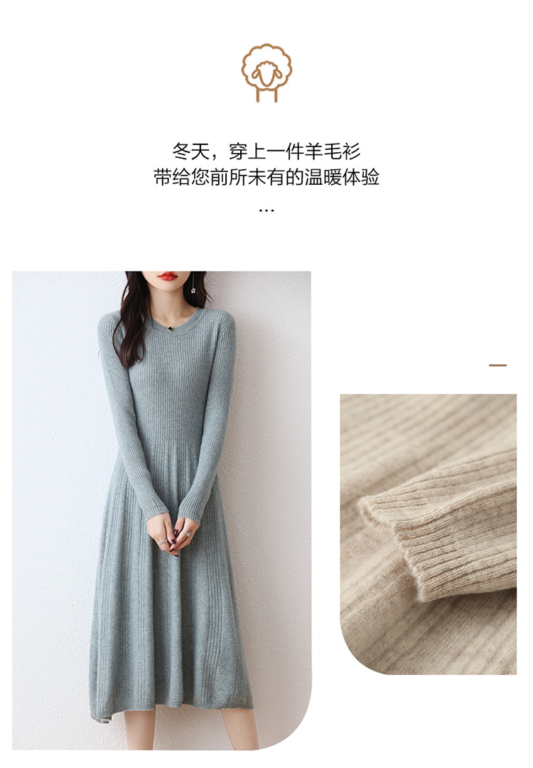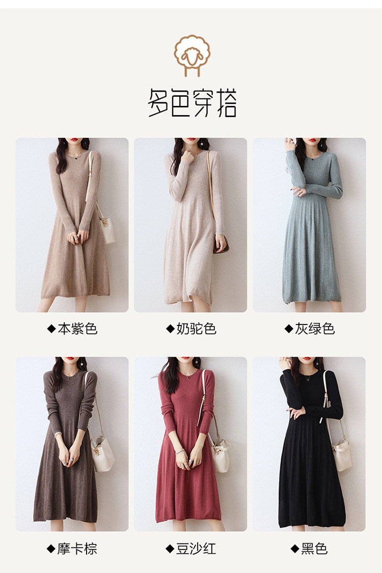Choice 100纯羊毛针织连衣裙女中长款过膝毛衣裙秋冬圆领羊绒打底大摆裙