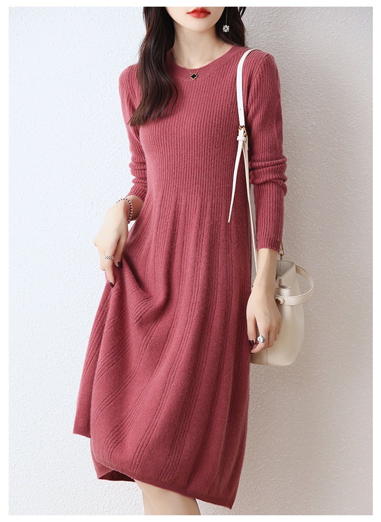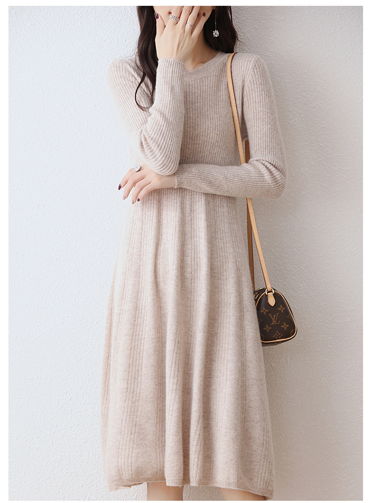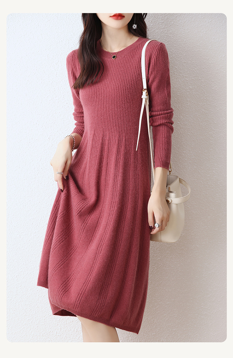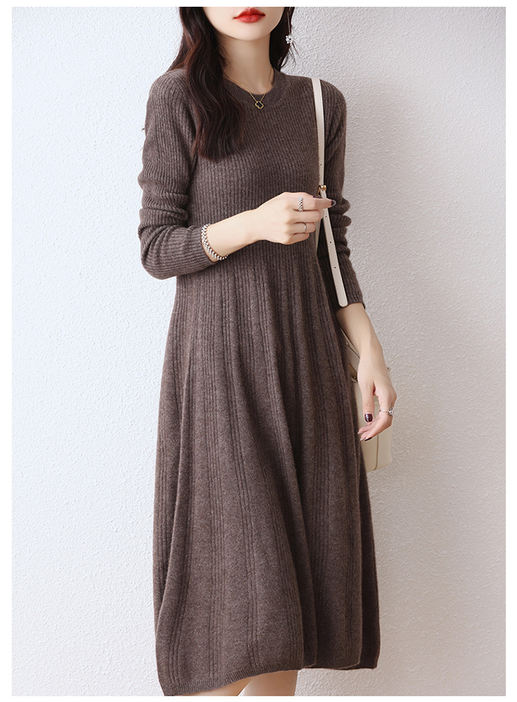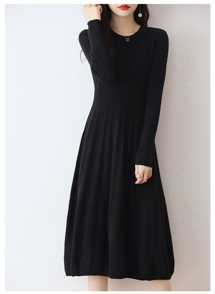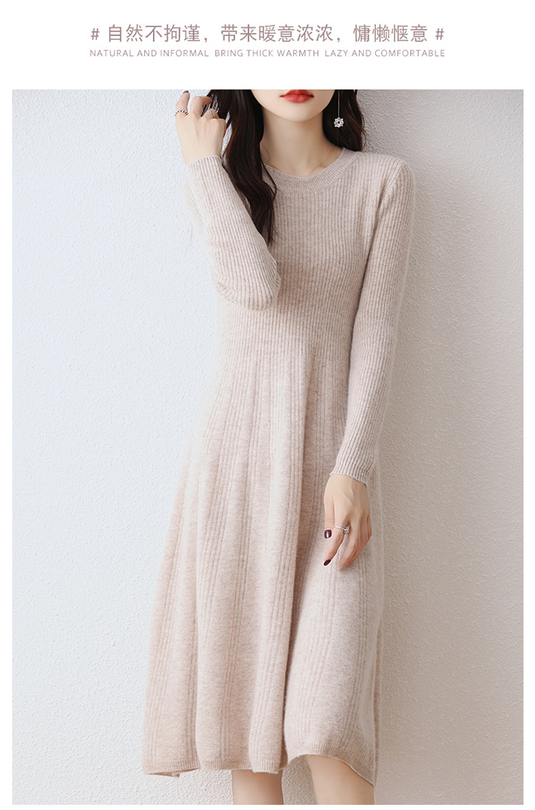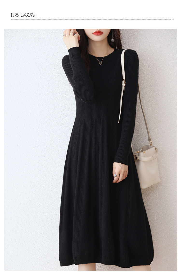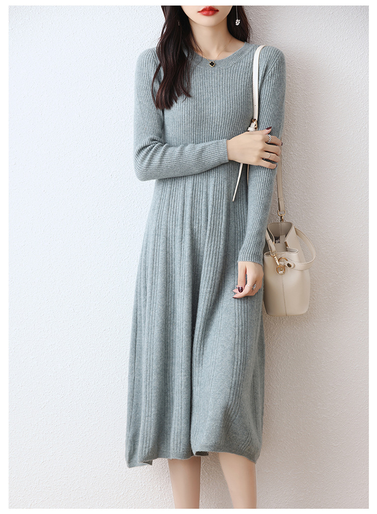 Choice 100纯羊毛针织连衣裙女中长款过膝毛衣裙秋冬圆领羊绒打底大摆裙