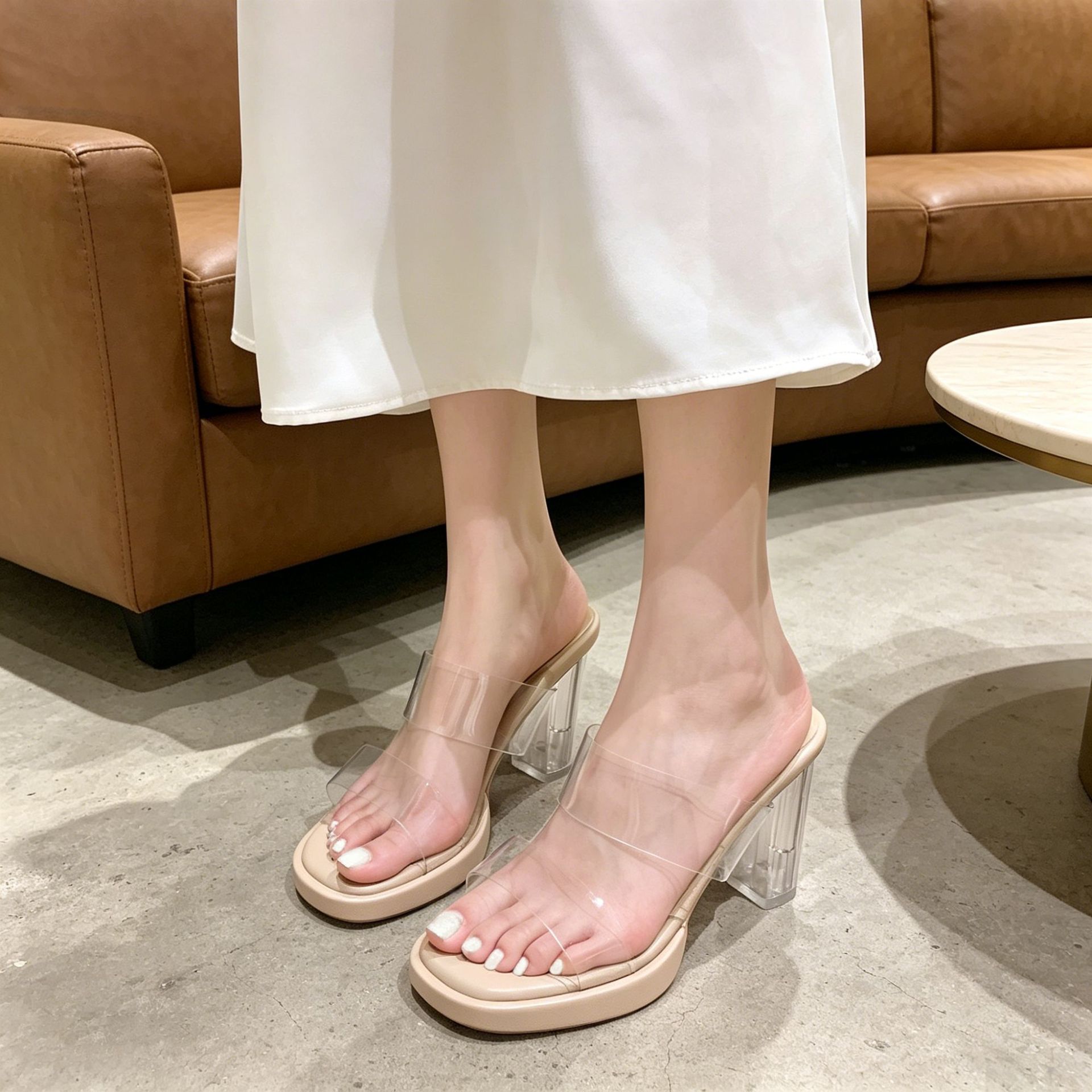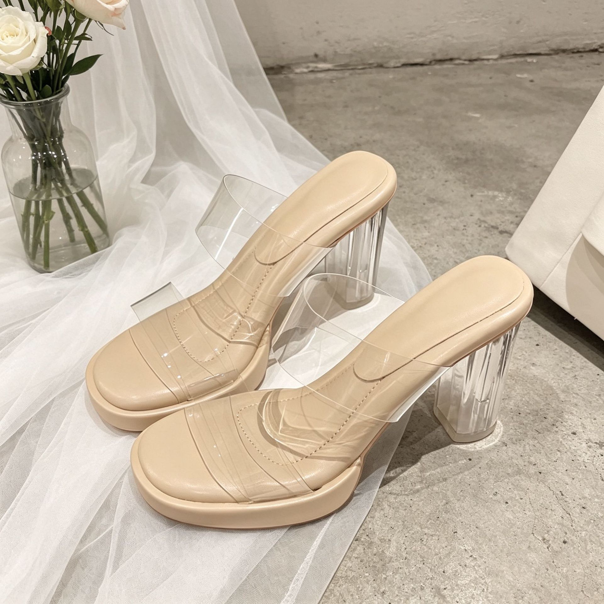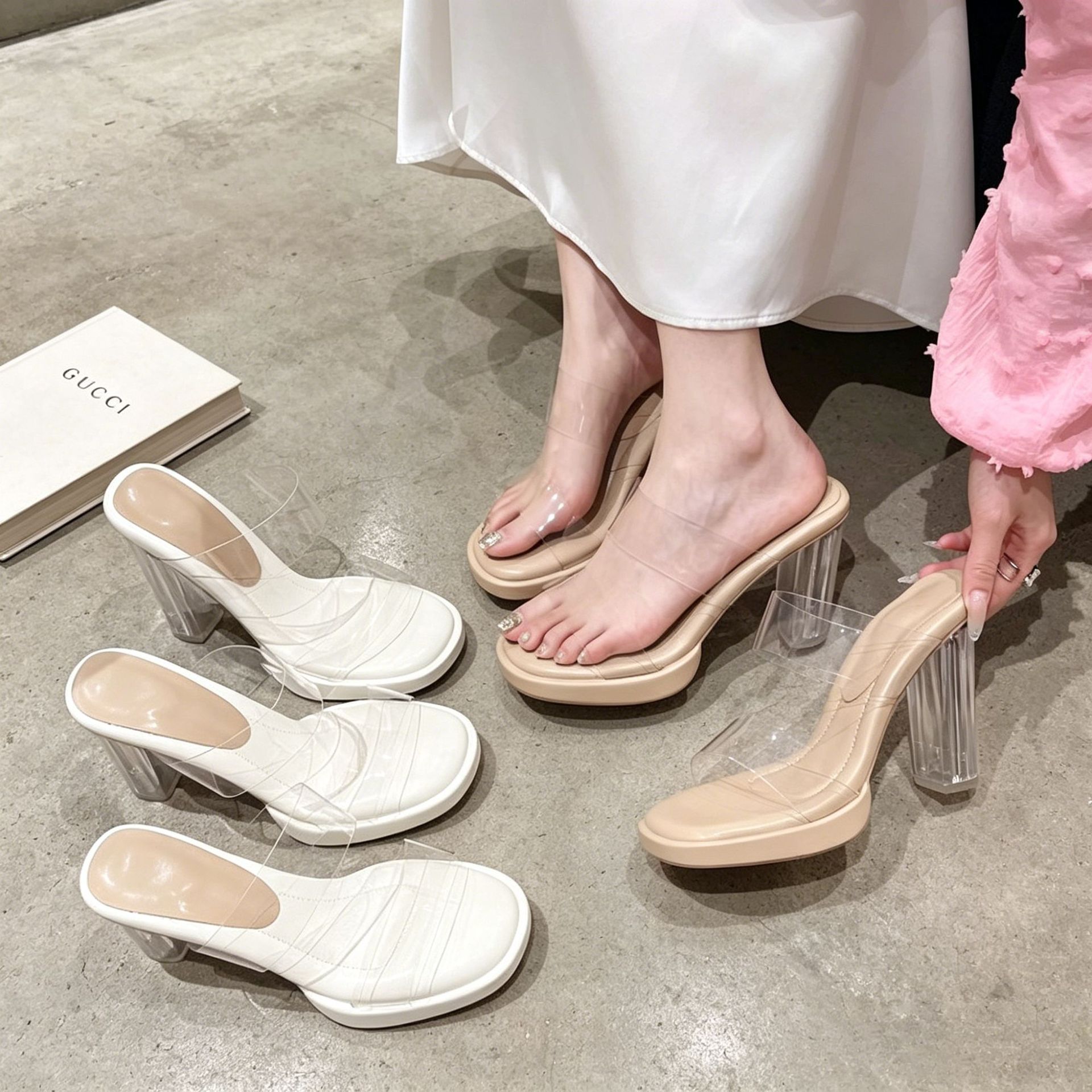 夏季外穿水晶跟高跟鞋女2025年新款防水台一字透明带粗跟凉鞋批发
