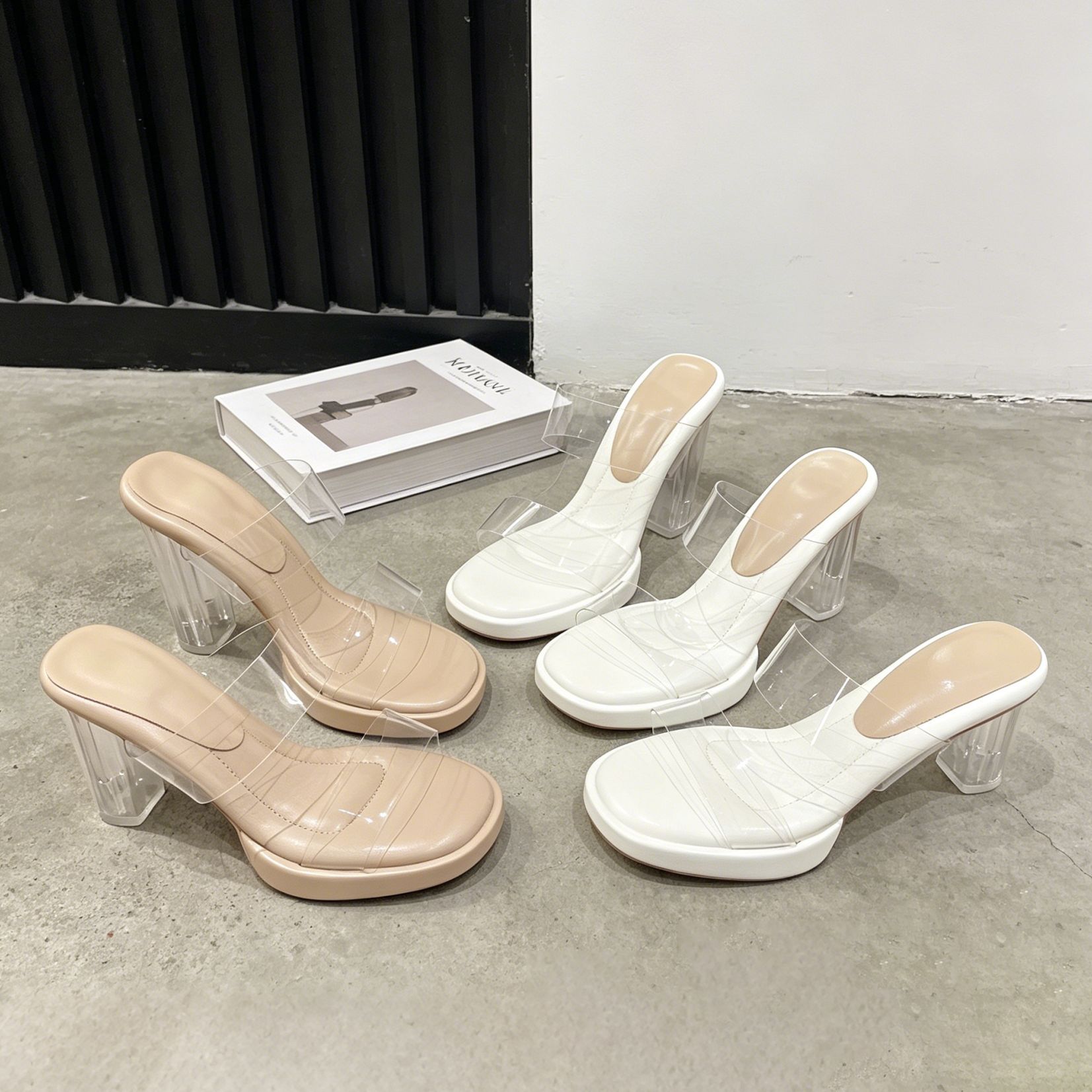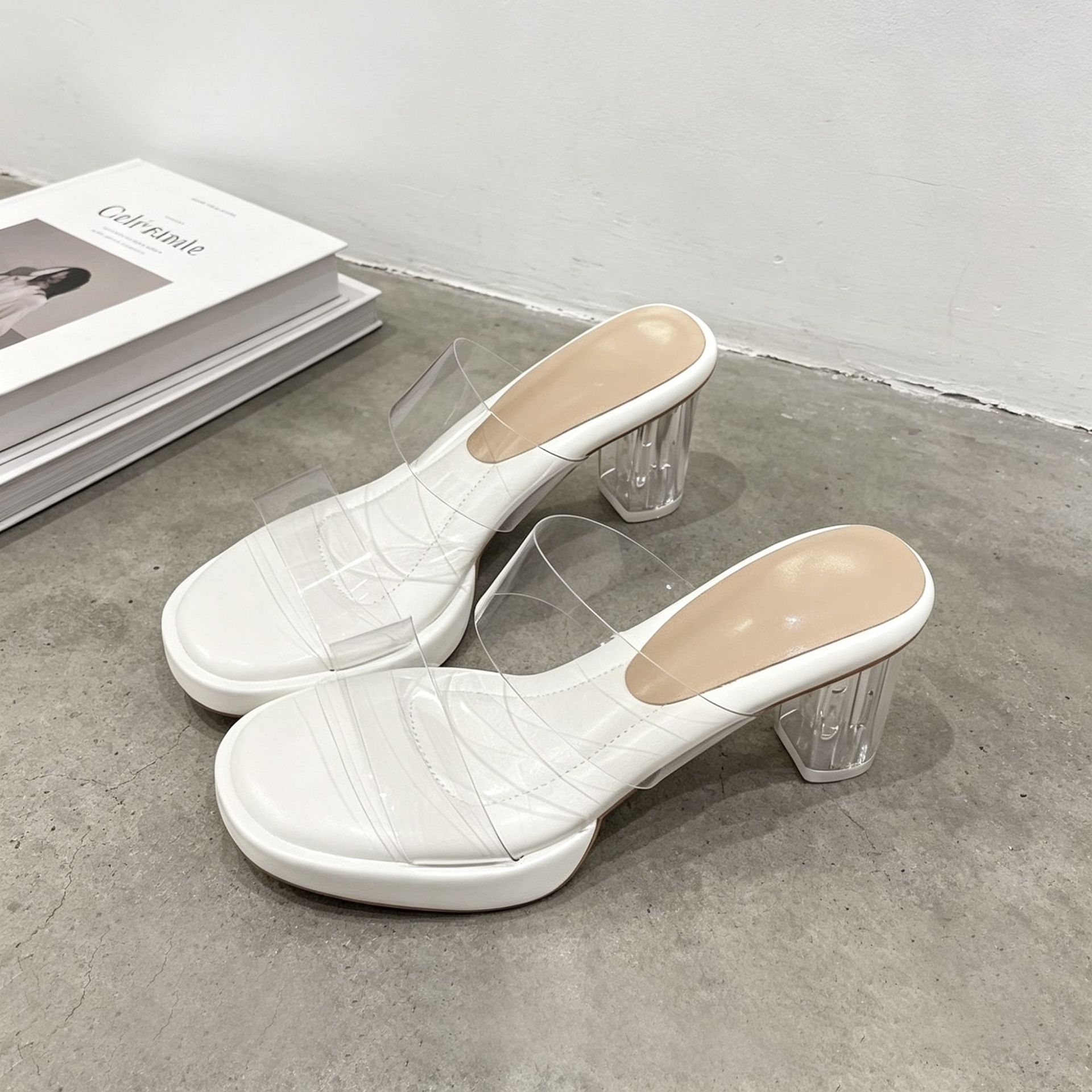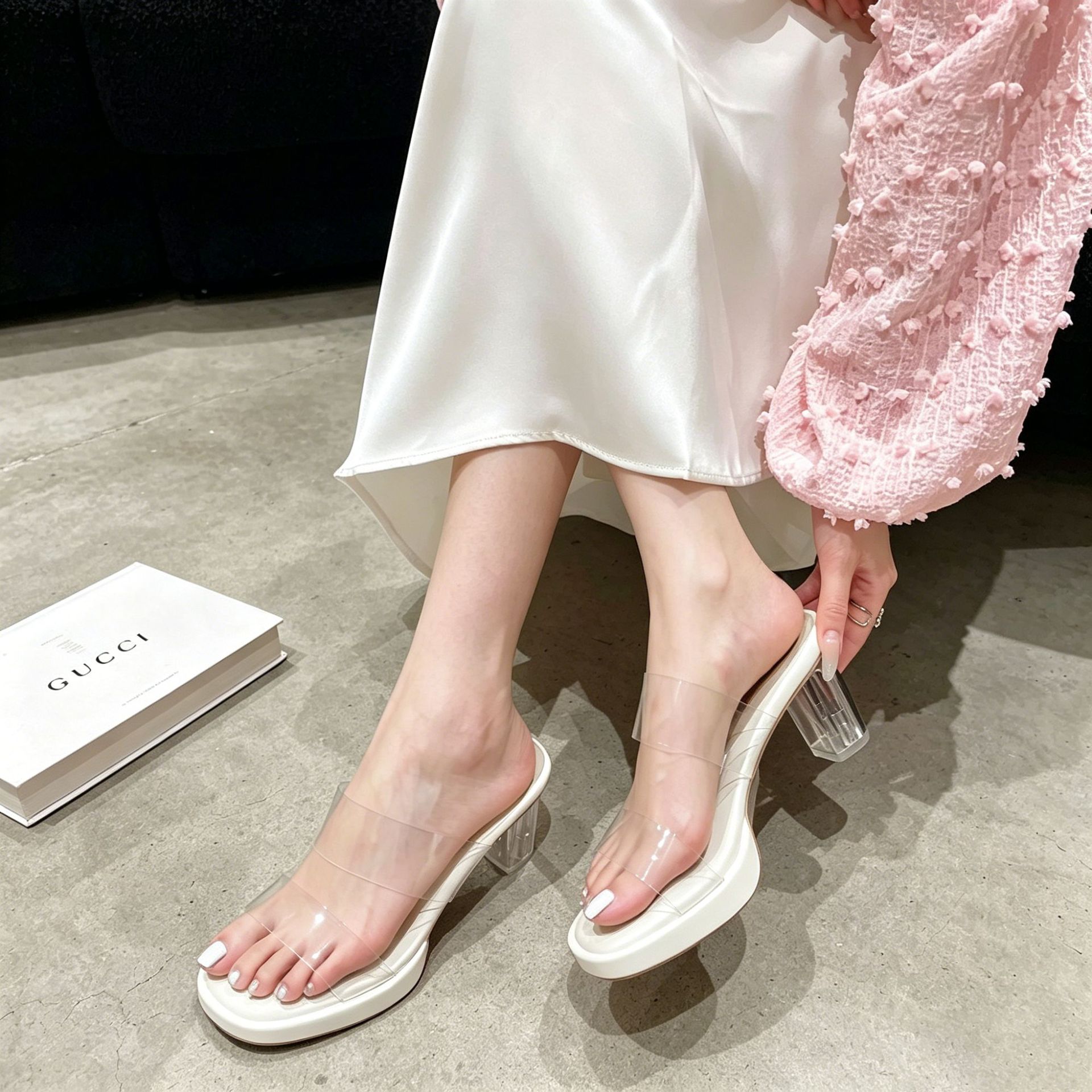 夏季外穿水晶跟高跟鞋女2025年新款防水台一字透明带粗跟凉鞋批发
