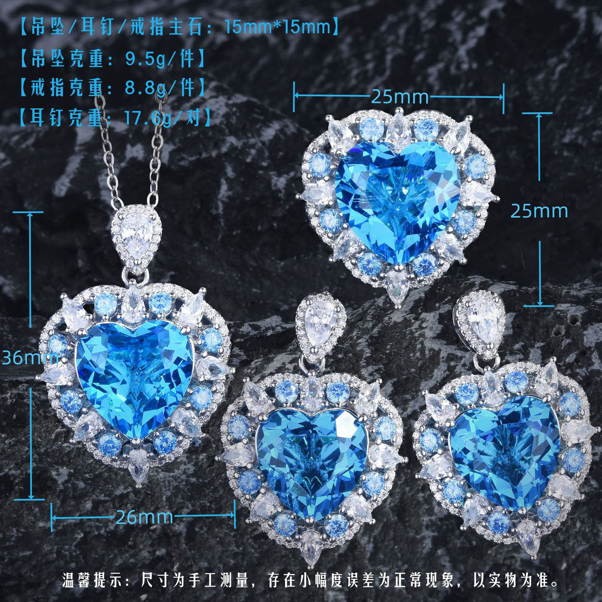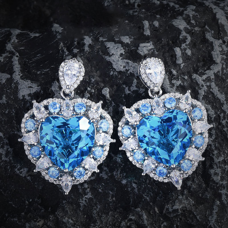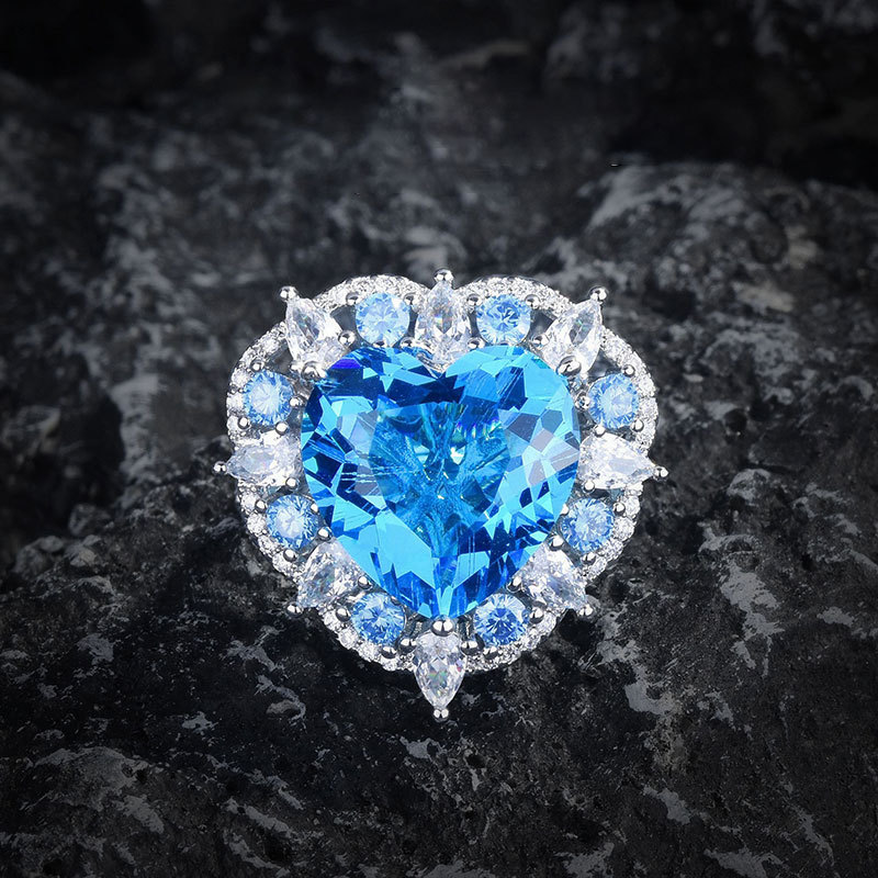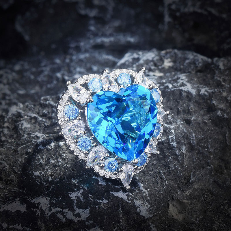 奢华重工托帕石爱心吊坠项链海洋之心戒指心形海蓝宝耳钉彩宝套装