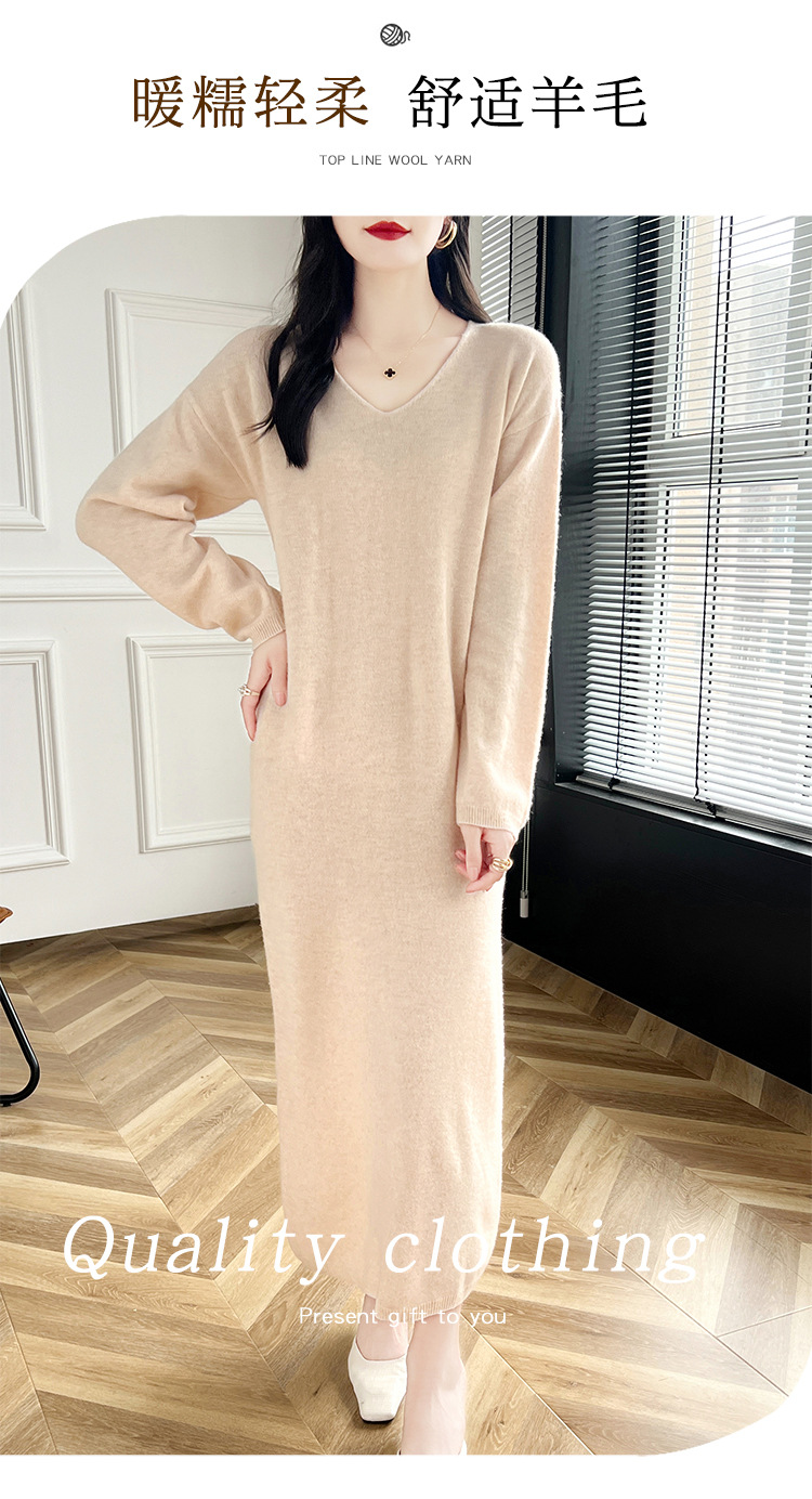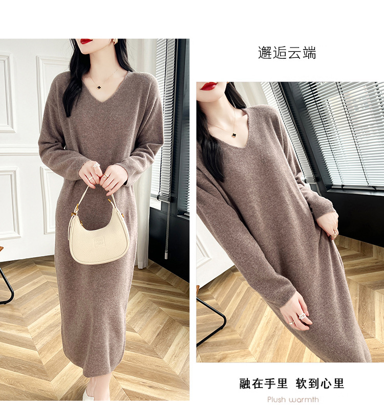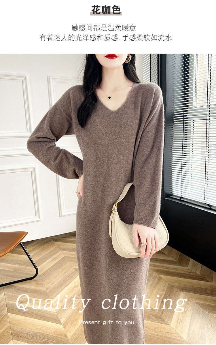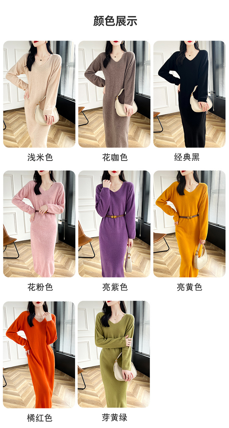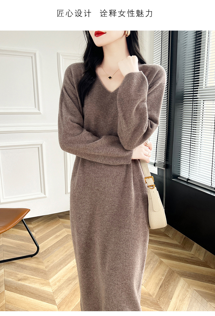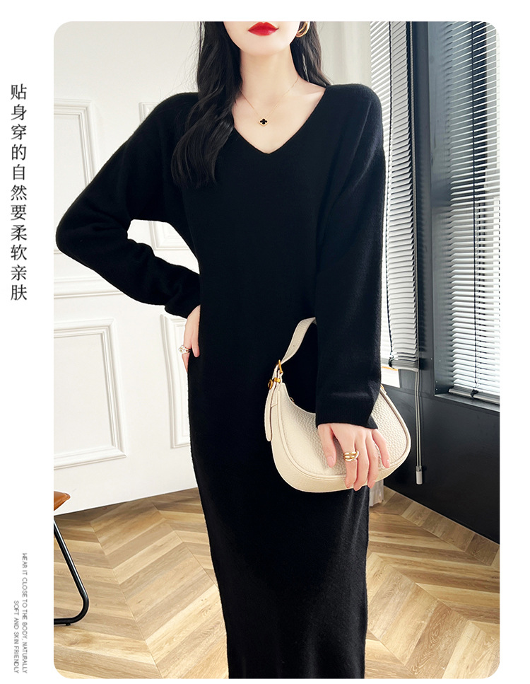 Choice 2024秋冬季新款V领羊毛衫女中长款过膝长裙修身连衣裙显瘦针织衫