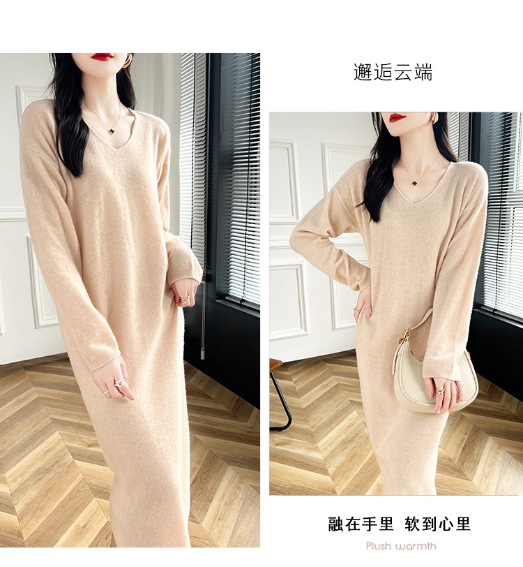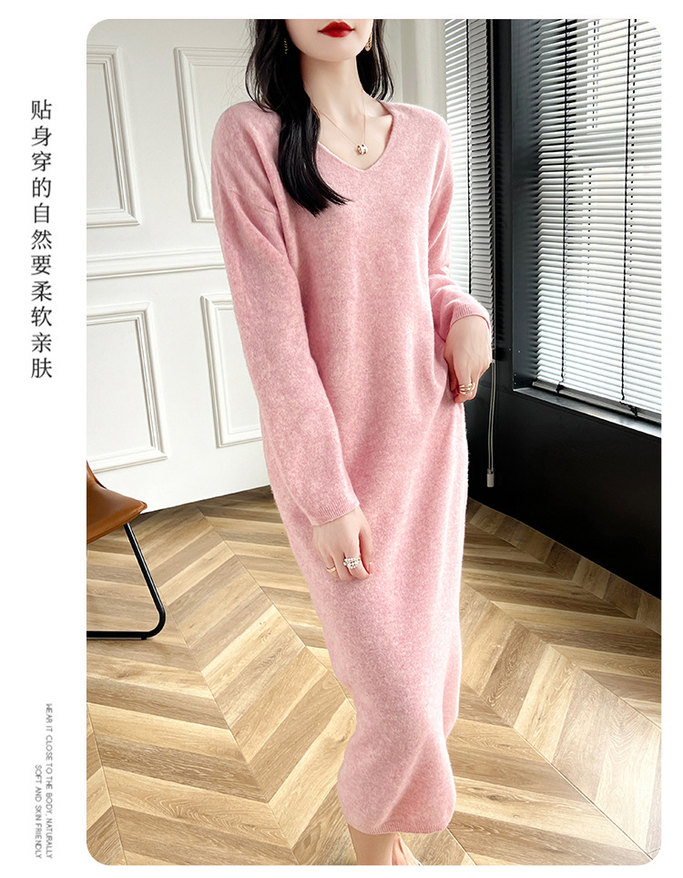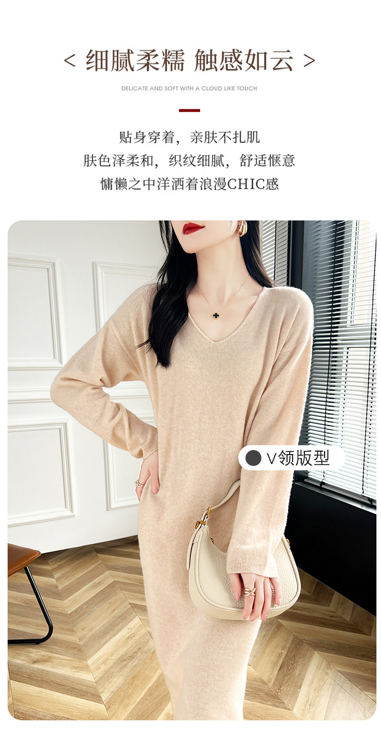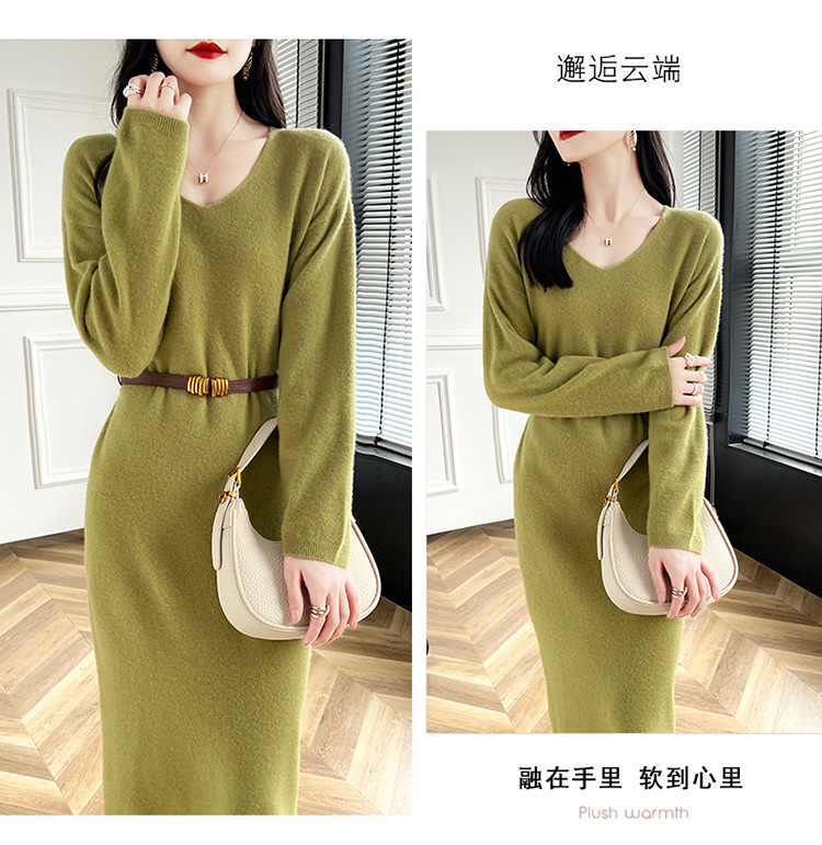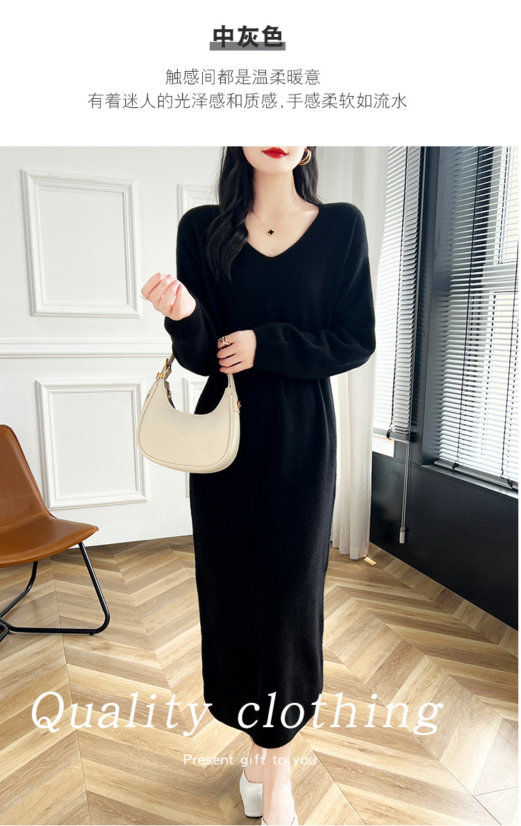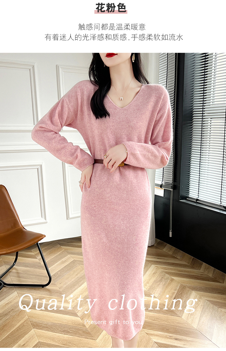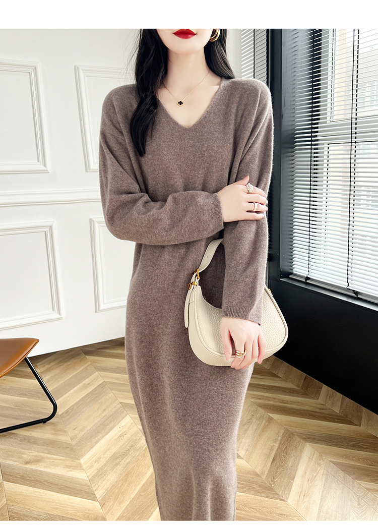 Choice 2024秋冬季新款V领羊毛衫女中长款过膝长裙修身连衣裙显瘦针织衫