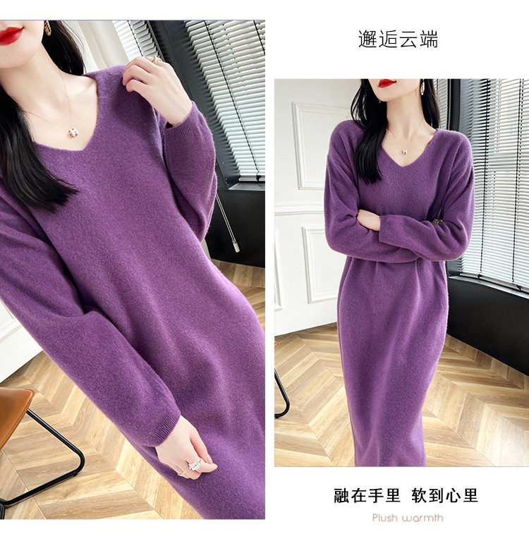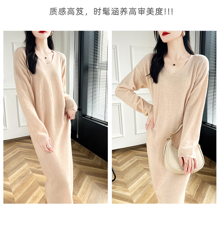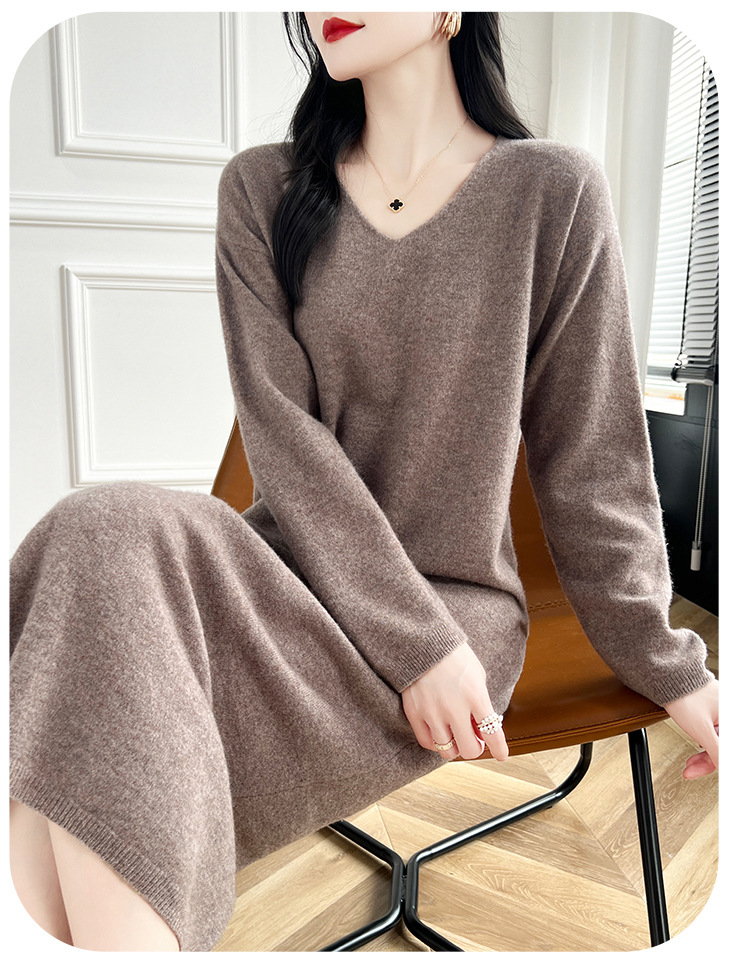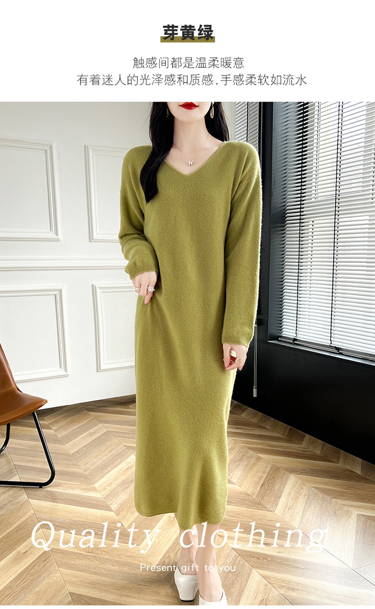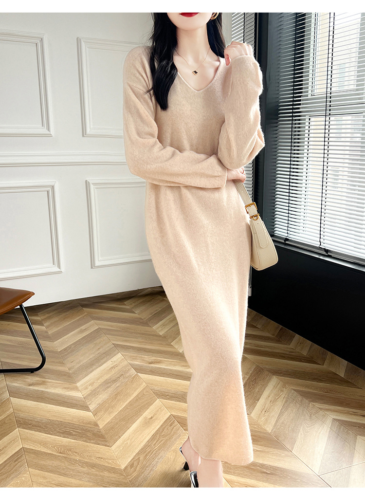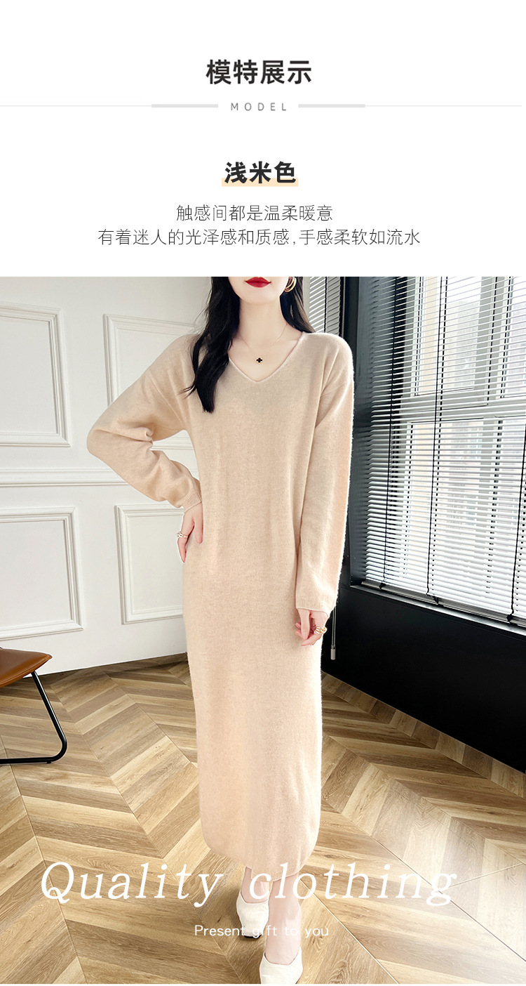 Choice 2024秋冬季新款V领羊毛衫女中长款过膝长裙修身连衣裙显瘦针织衫