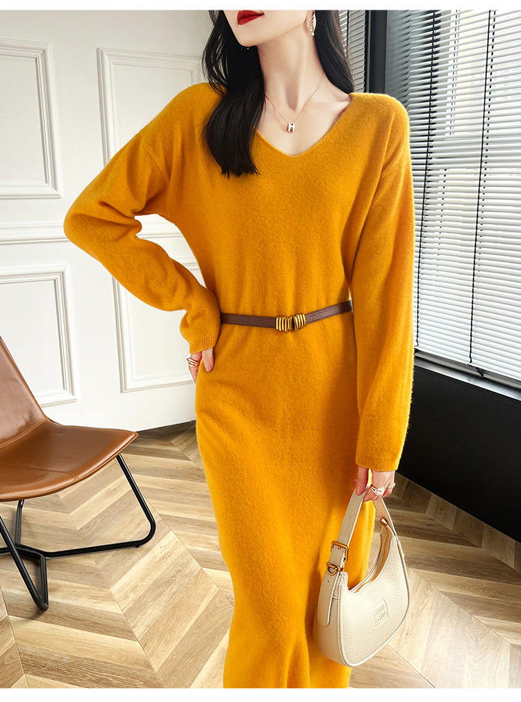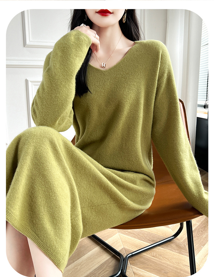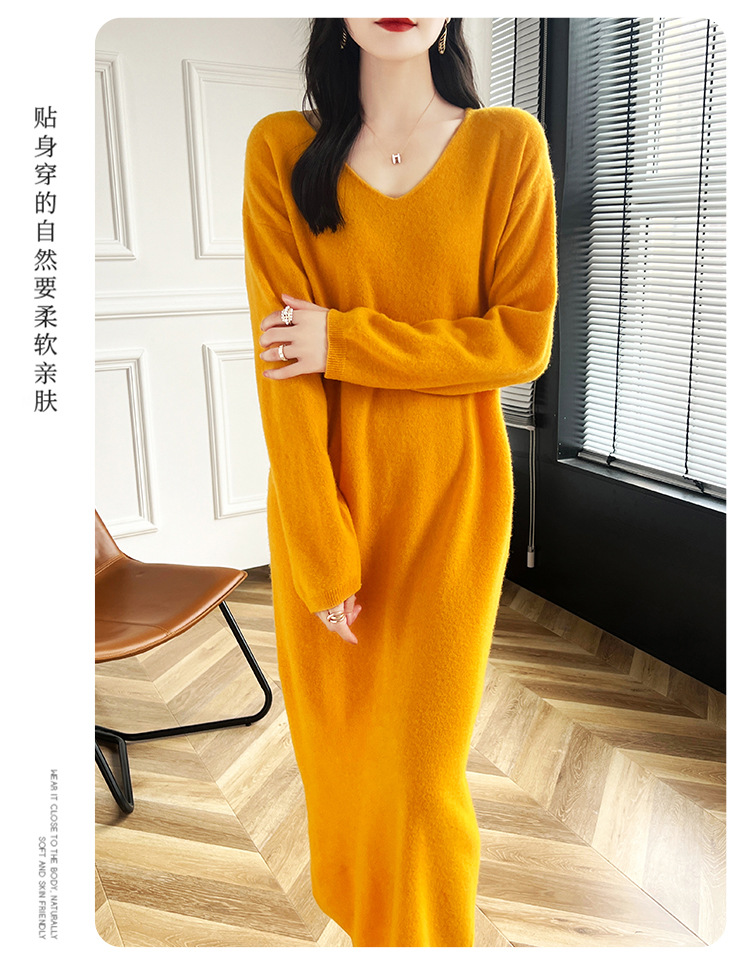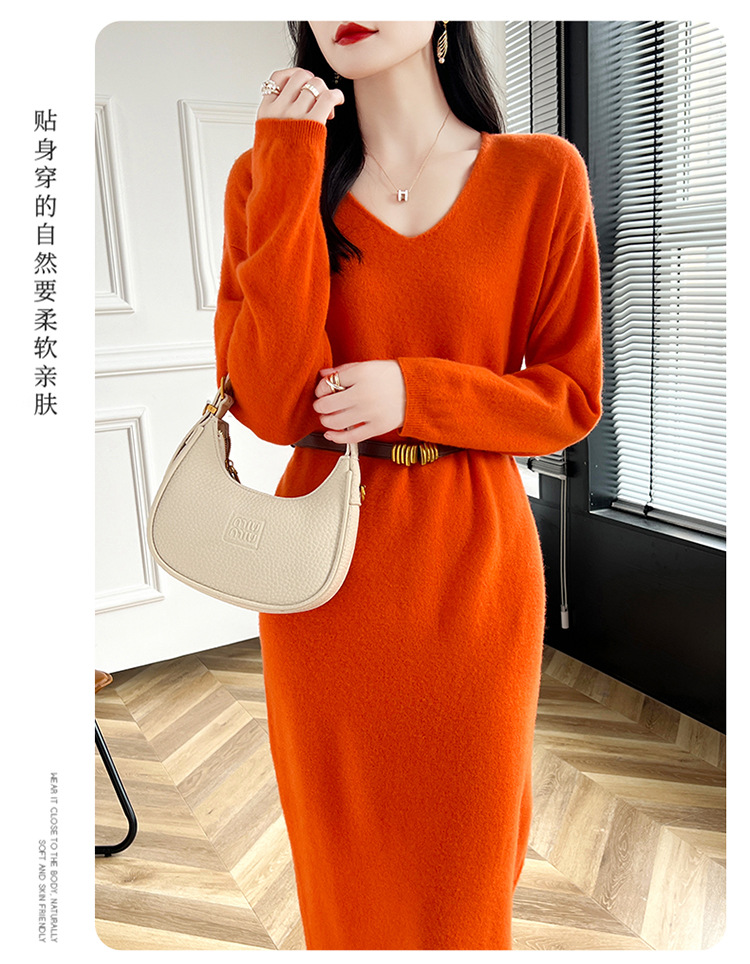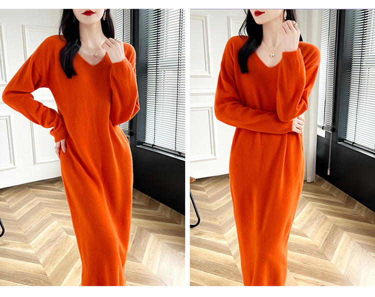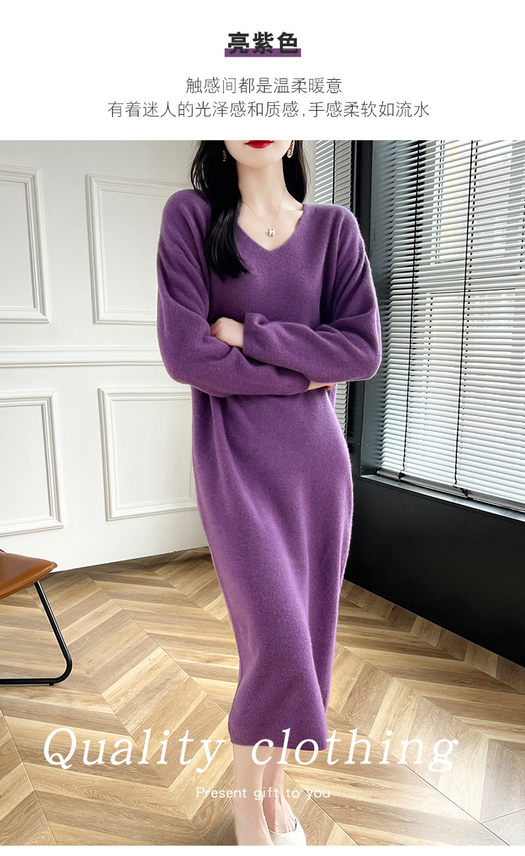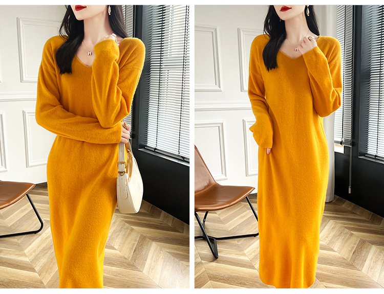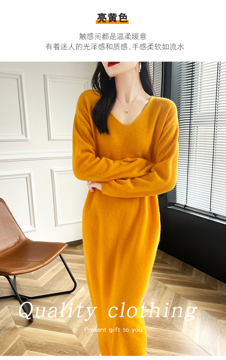 Choice 2024秋冬季新款V领羊毛衫女中长款过膝长裙修身连衣裙显瘦针织衫