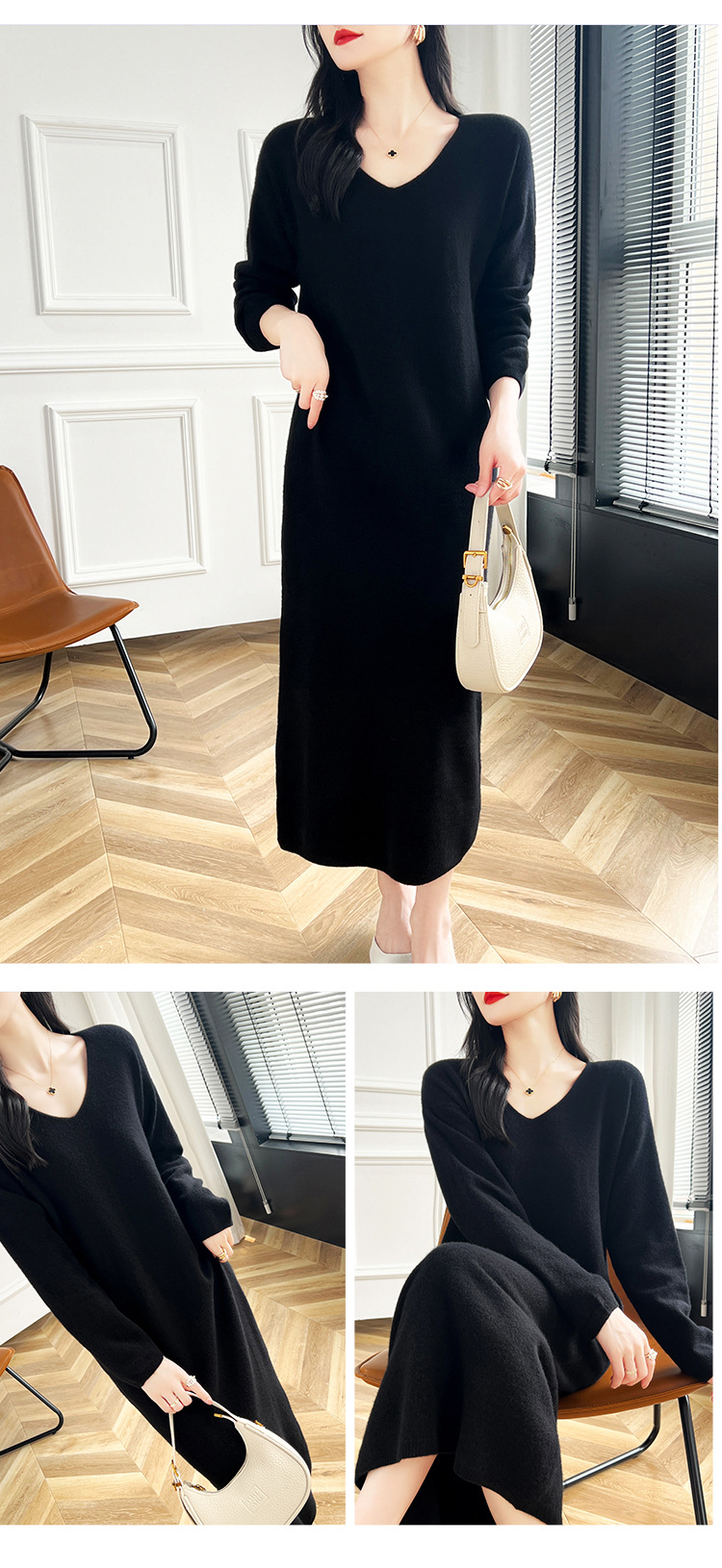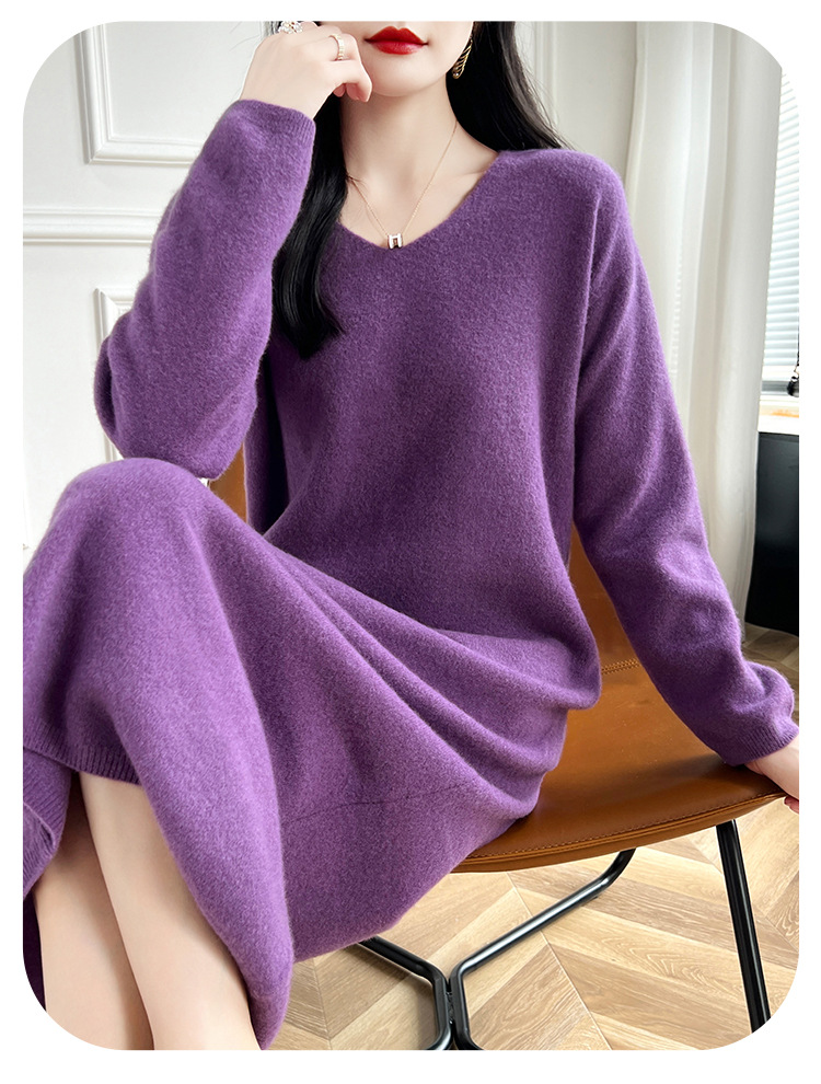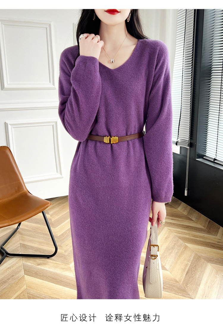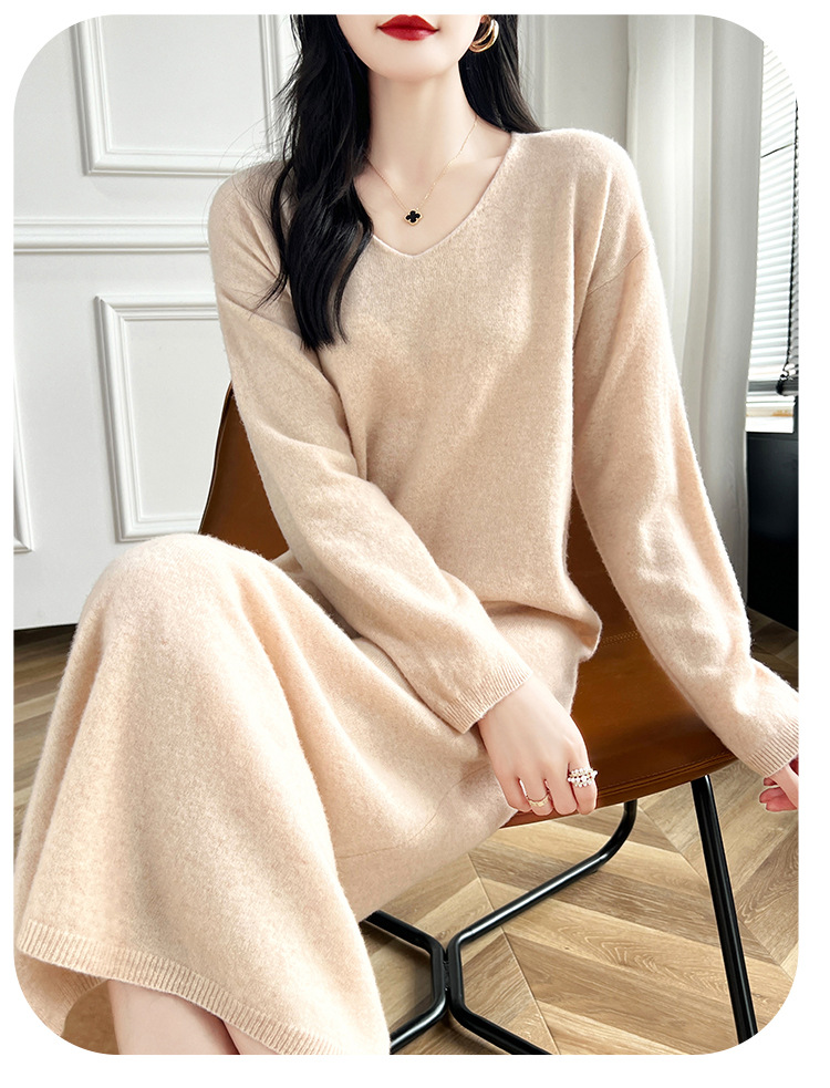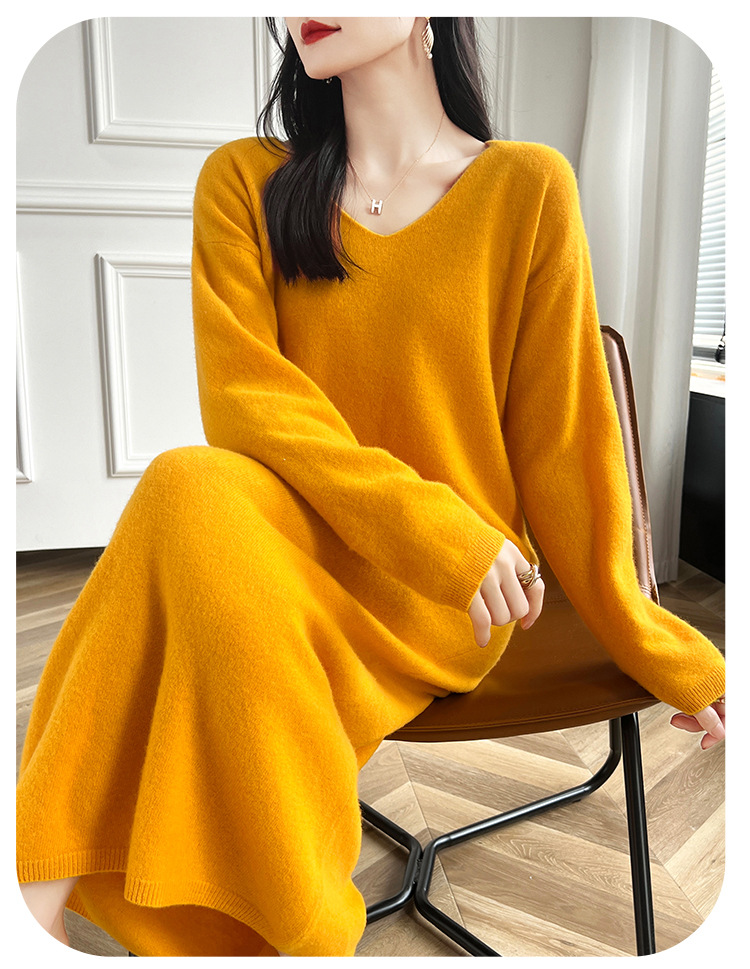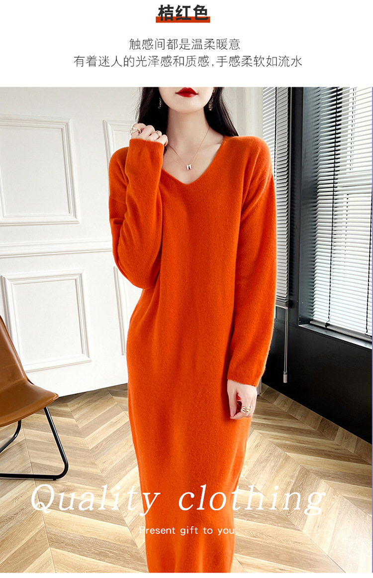 Choice 2024秋冬季新款V领羊毛衫女中长款过膝长裙修身连衣裙显瘦针织衫
