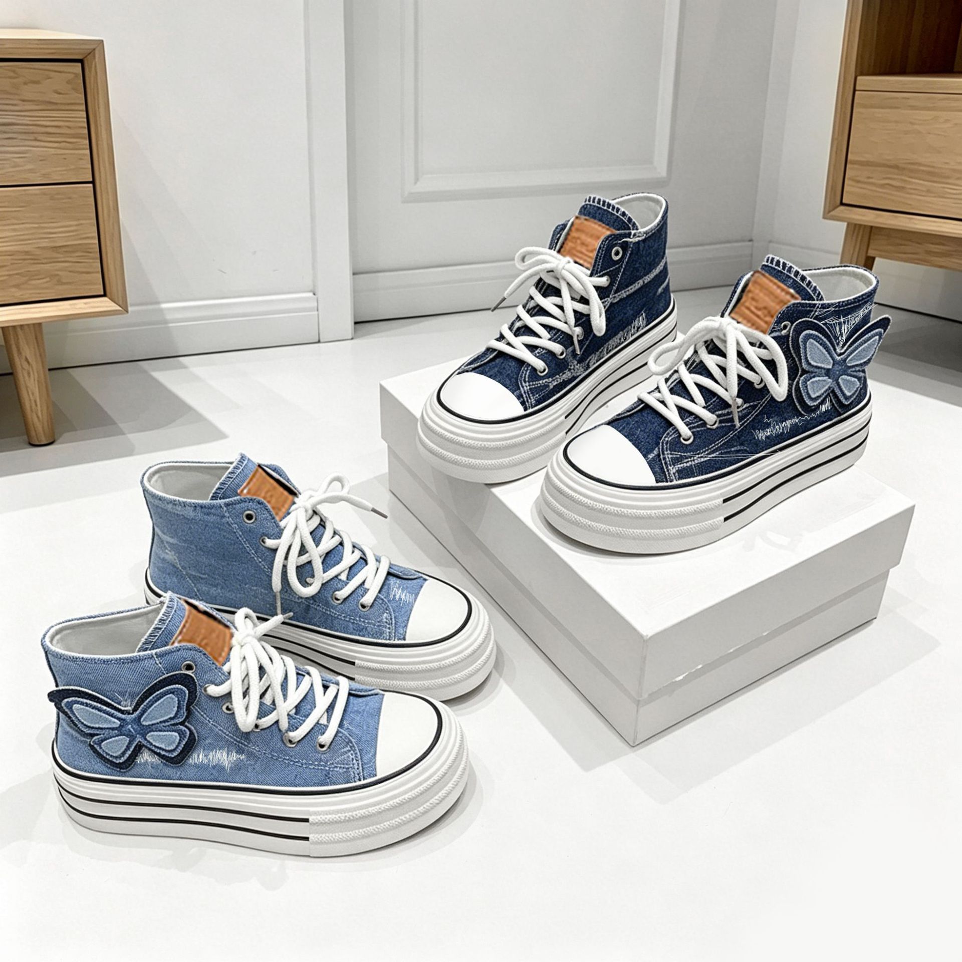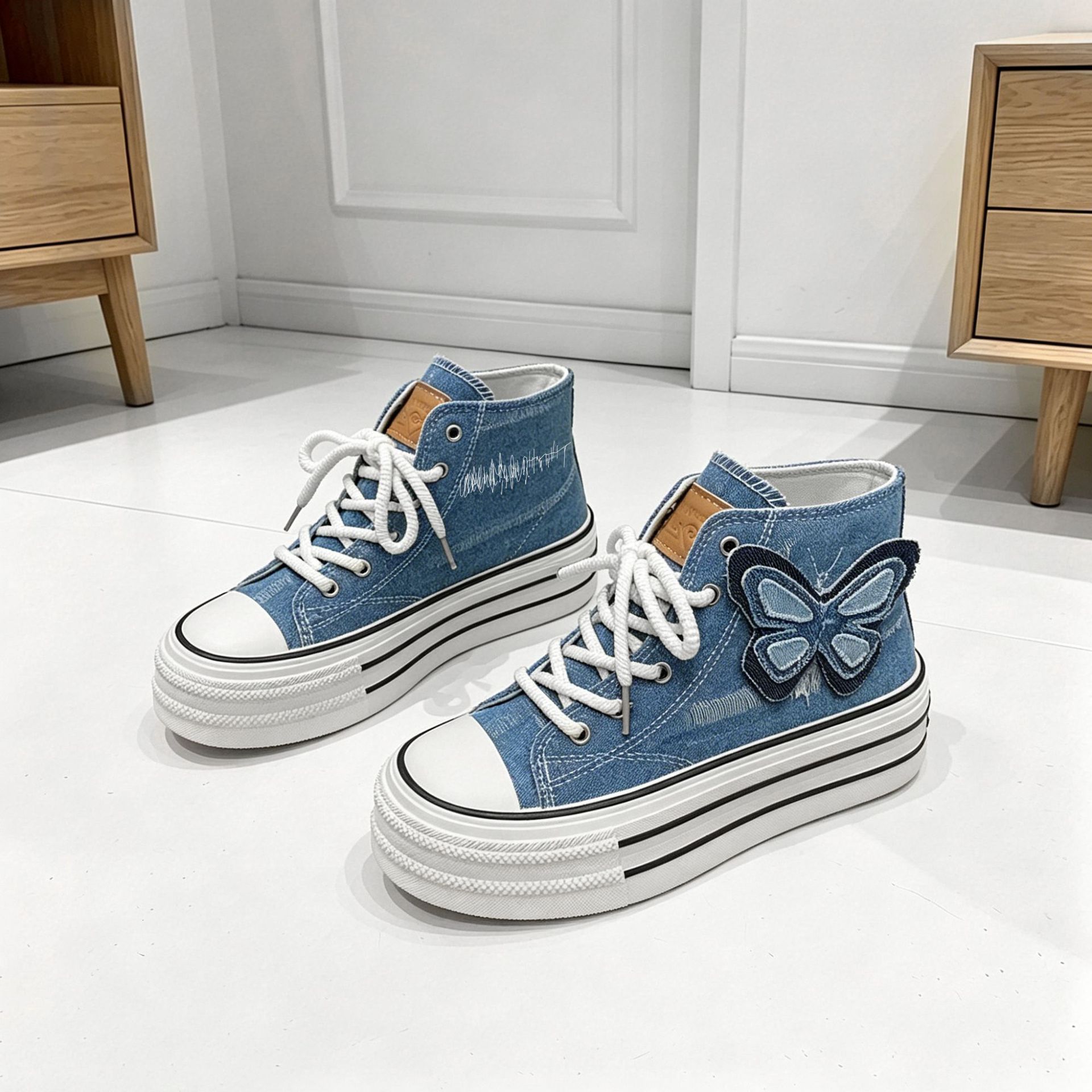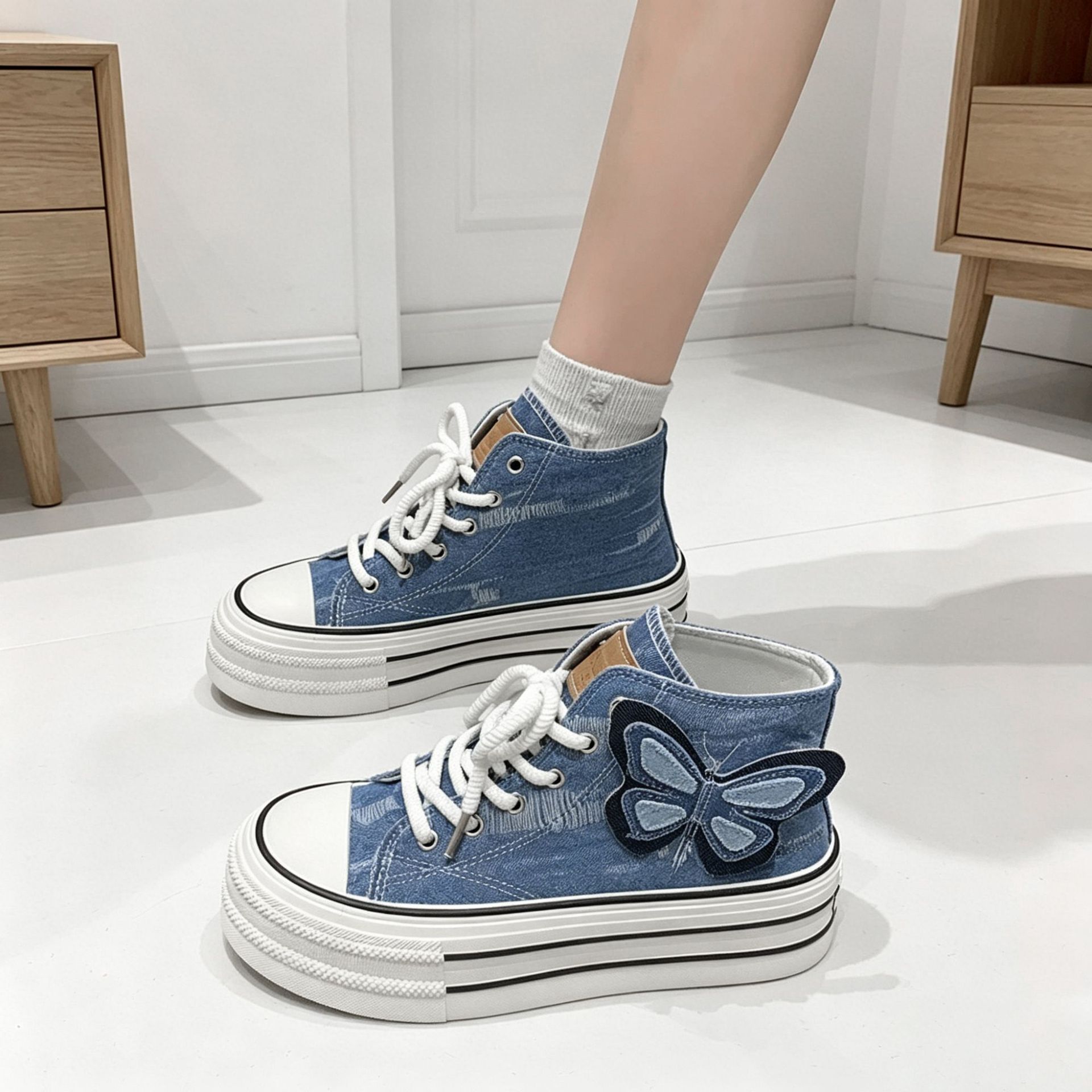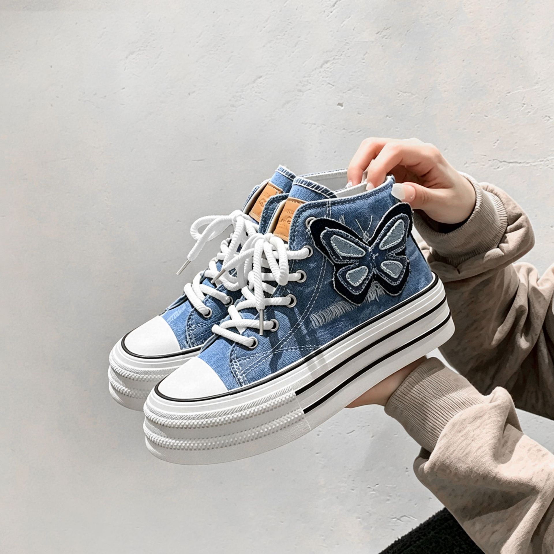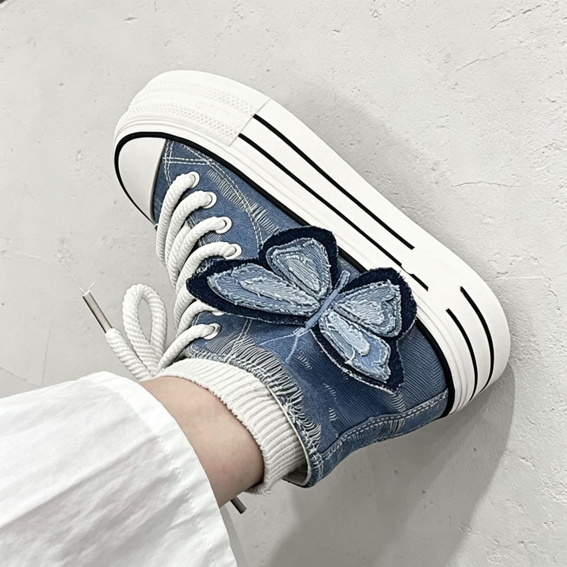 高帮韩版帆布鞋外贸2025秋季新款时尚可爱厚底鞋蝴蝶休闲系带单鞋
