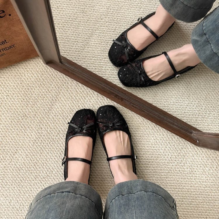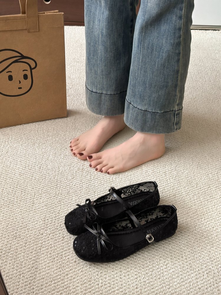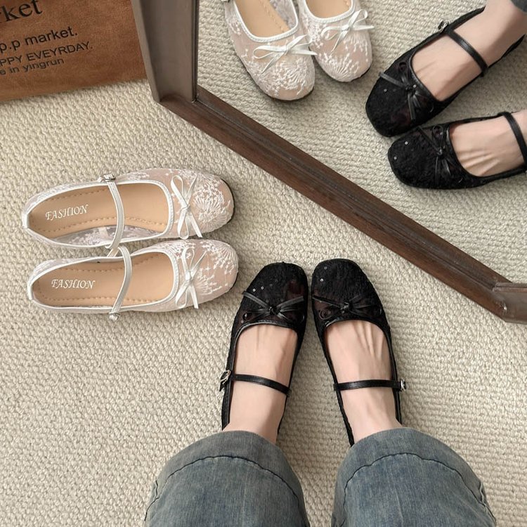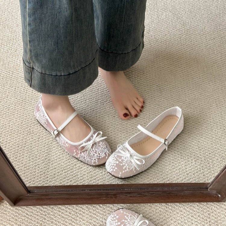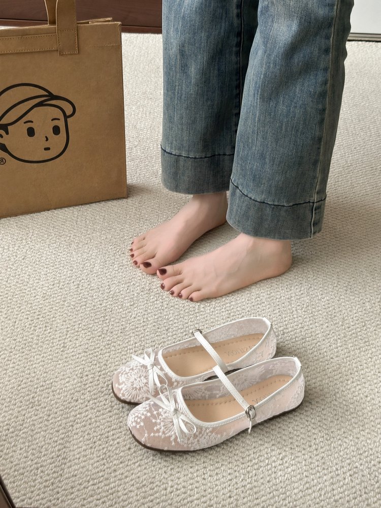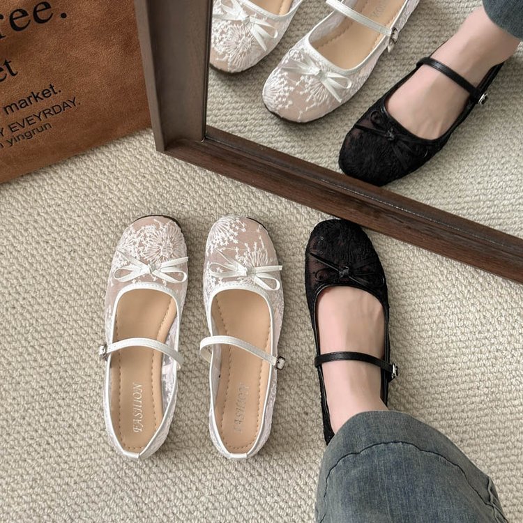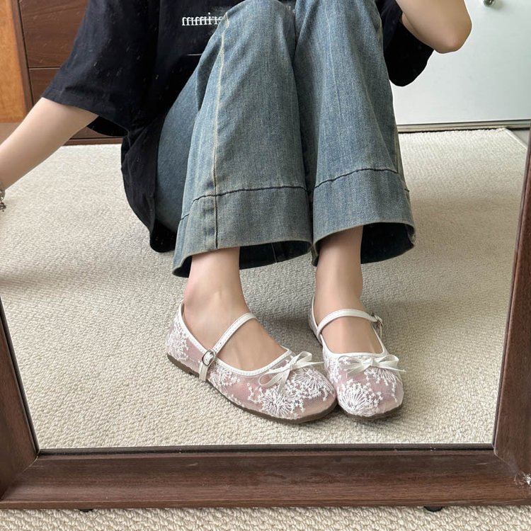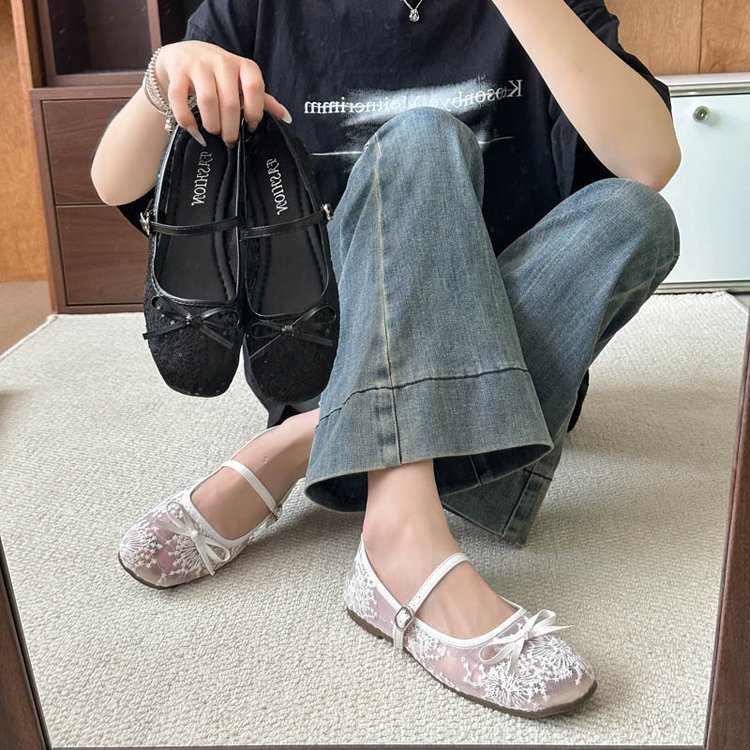 软底不累脚网纱平底鞋女2025新款绣花蝴蝶结单鞋性感镂空玛丽珍鞋