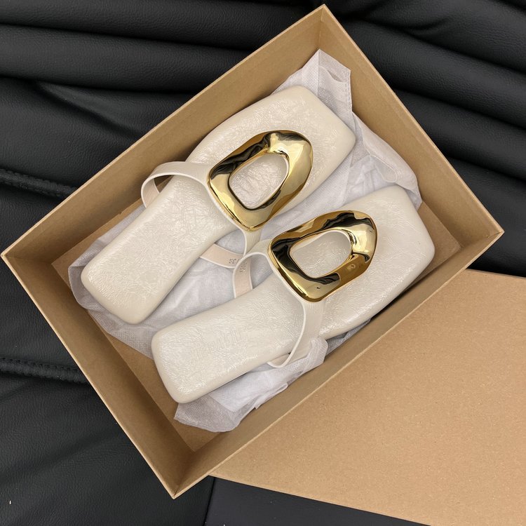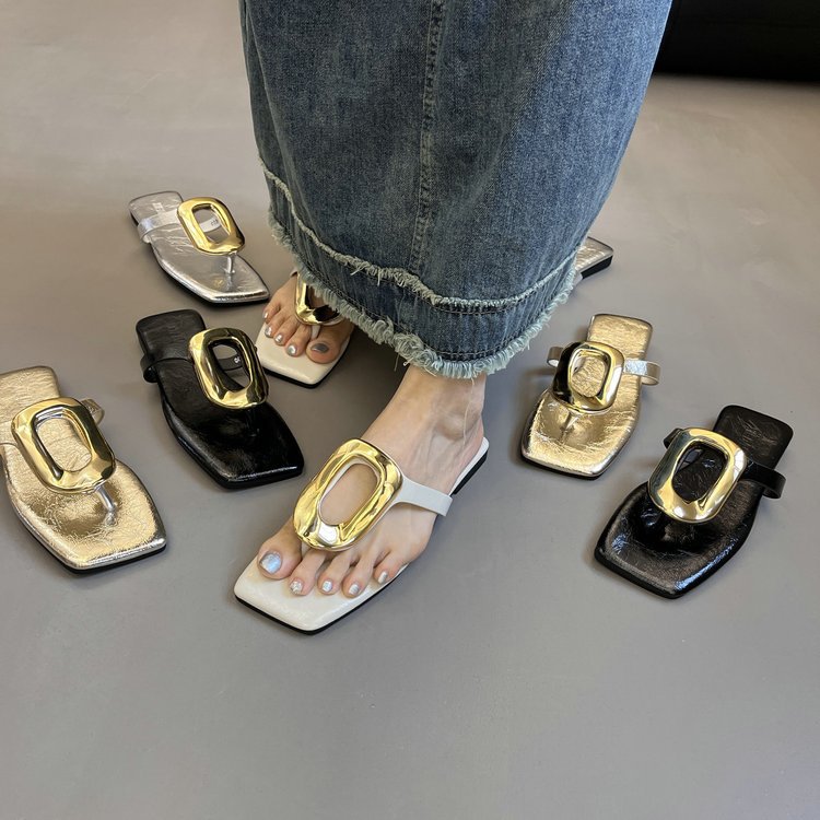 韩版方头露趾人字拖鞋2025年外穿夹趾平底鞋夏季金属扣小众凉拖鞋