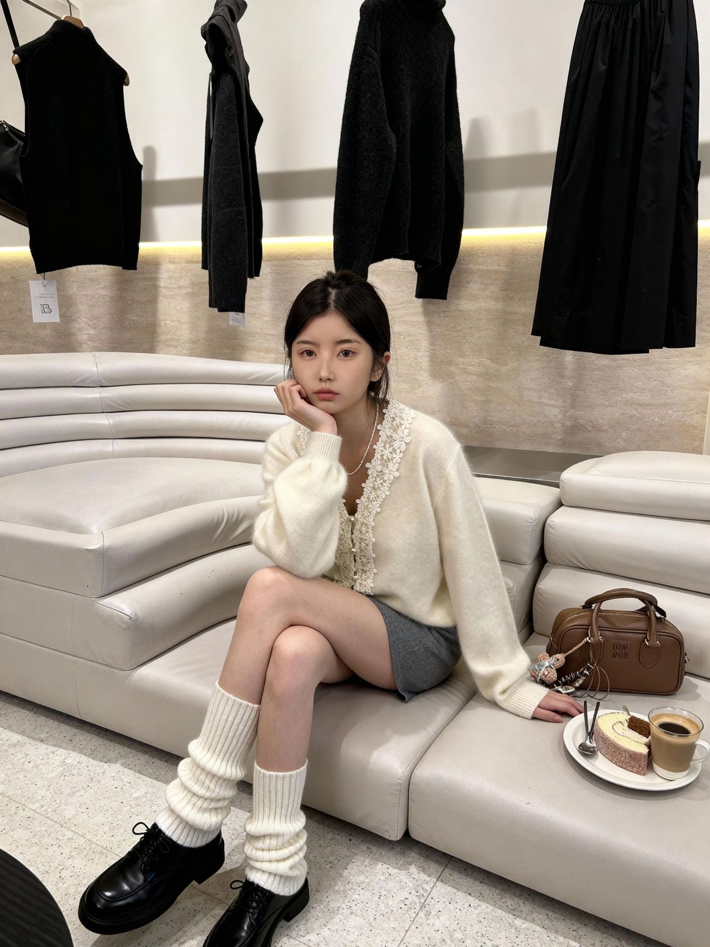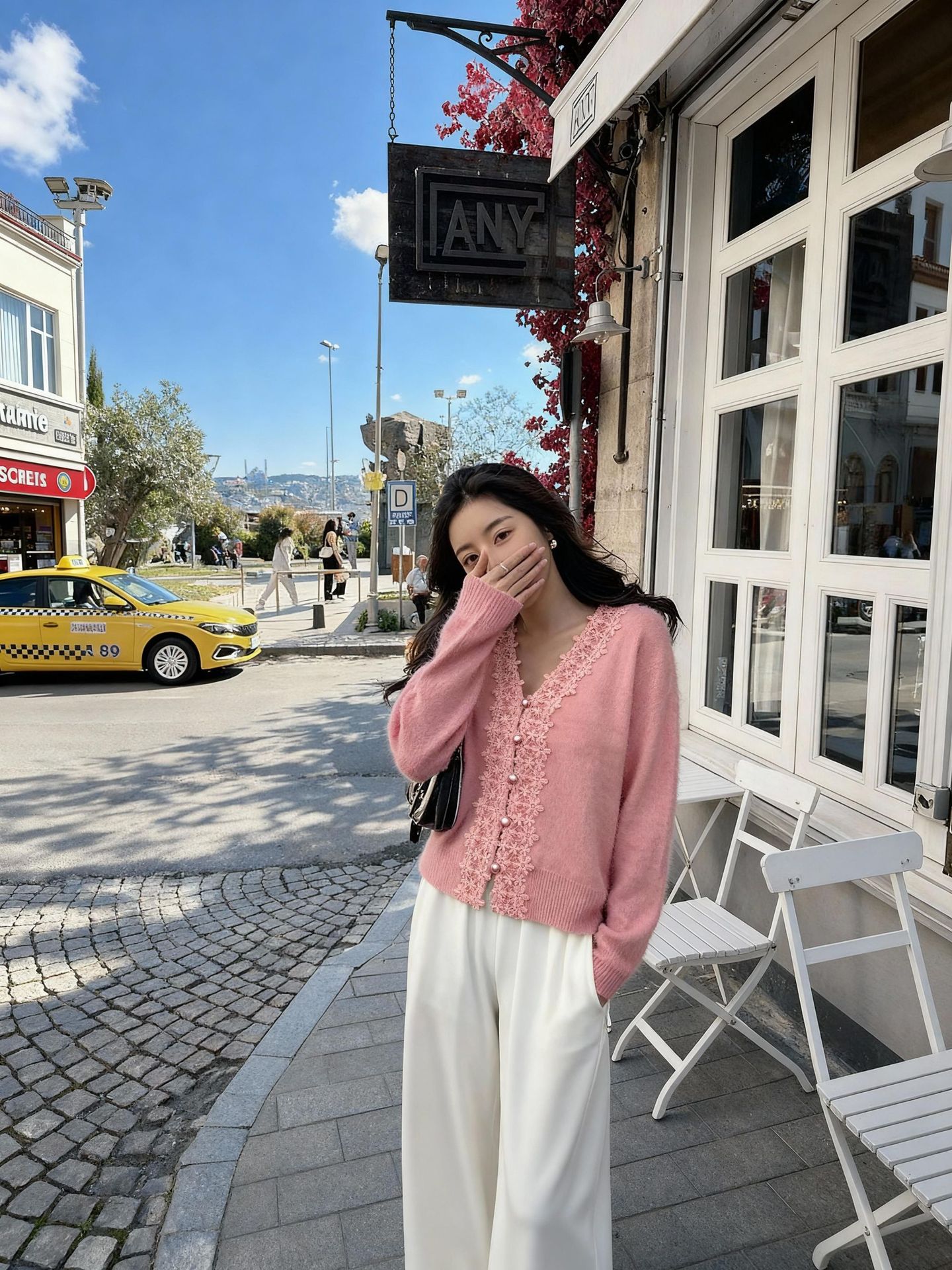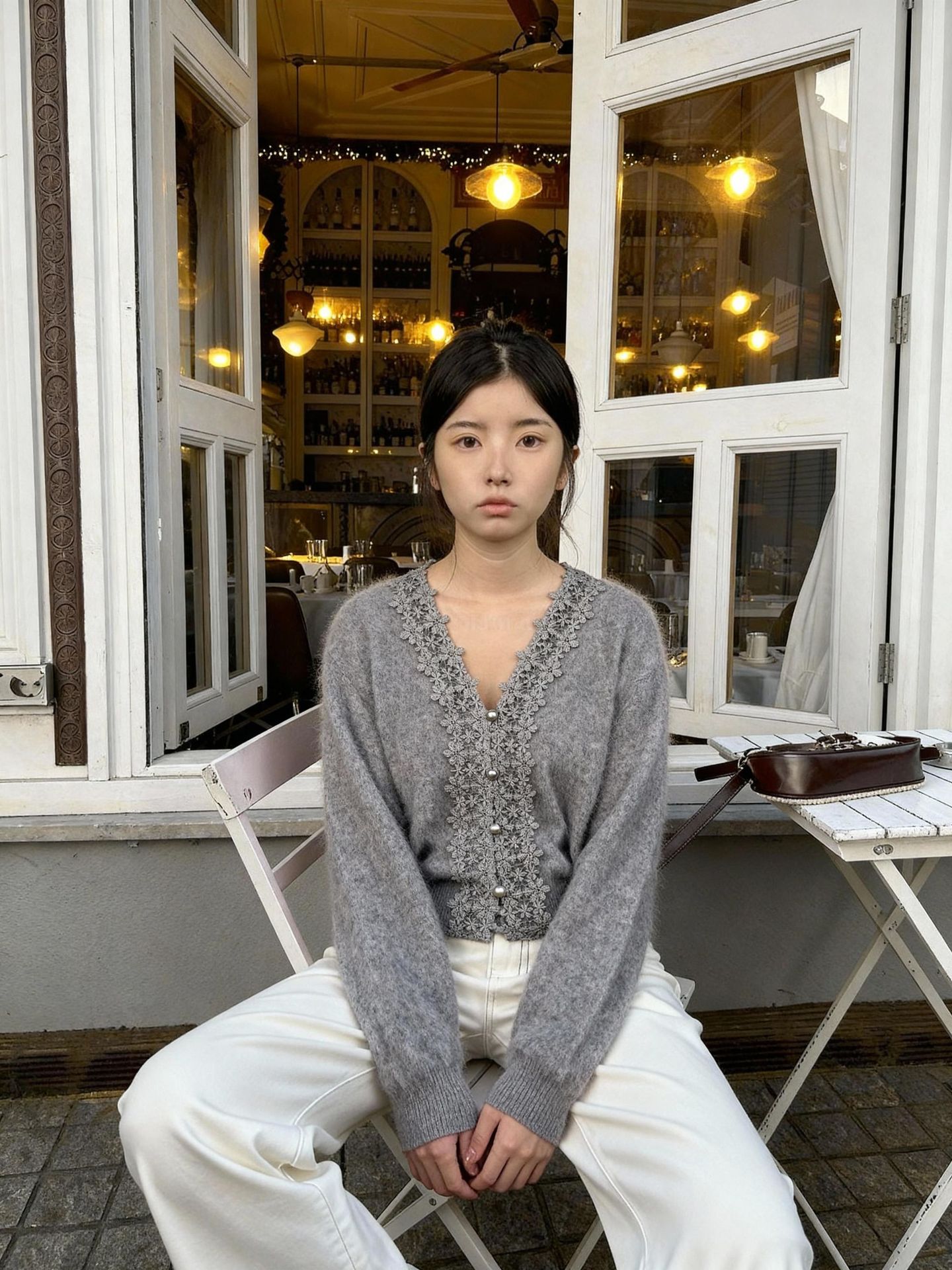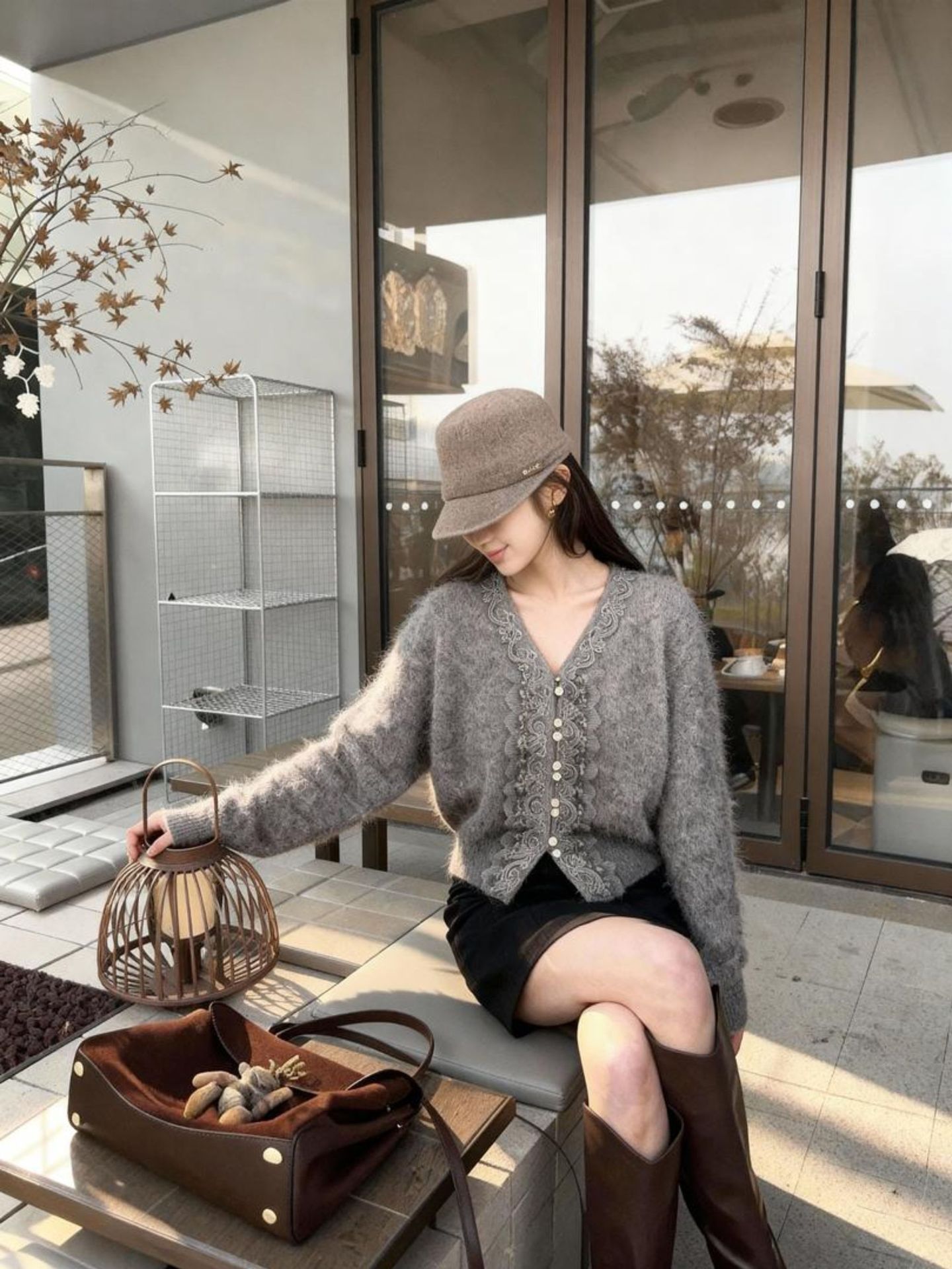 Choice 羊毛羊绒拉毛V领百搭毛衣宽松慵懒女开衫外套立体蕾丝重工针织女