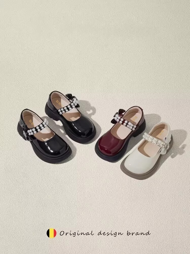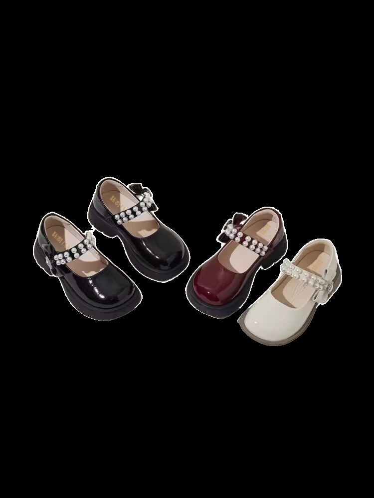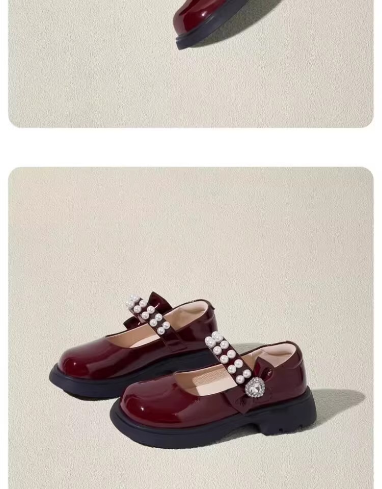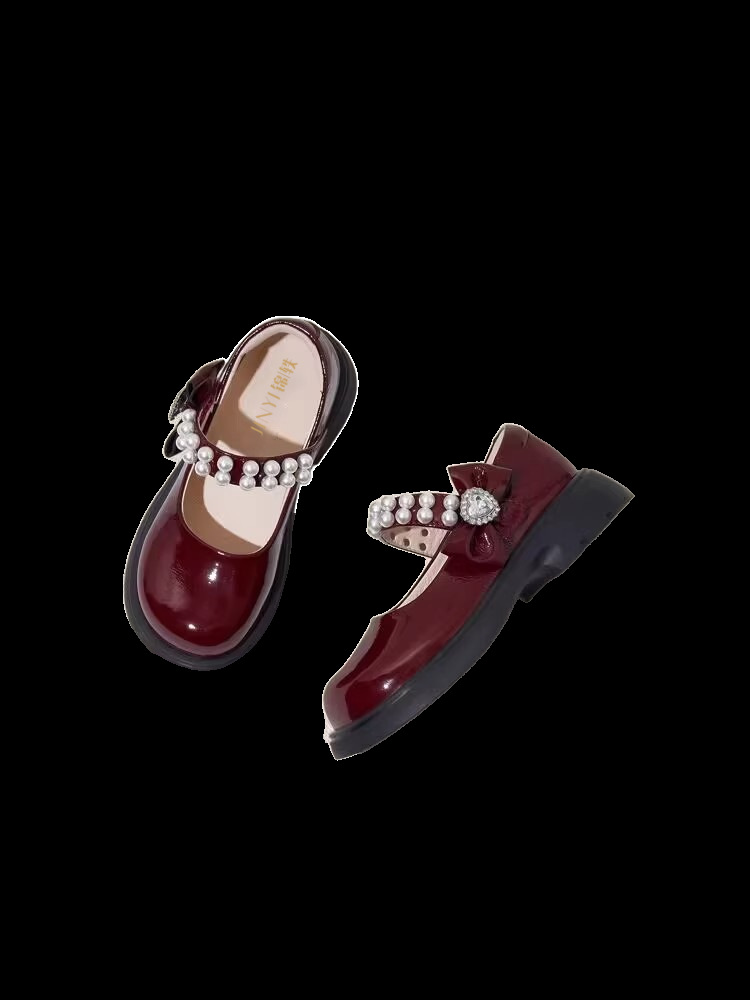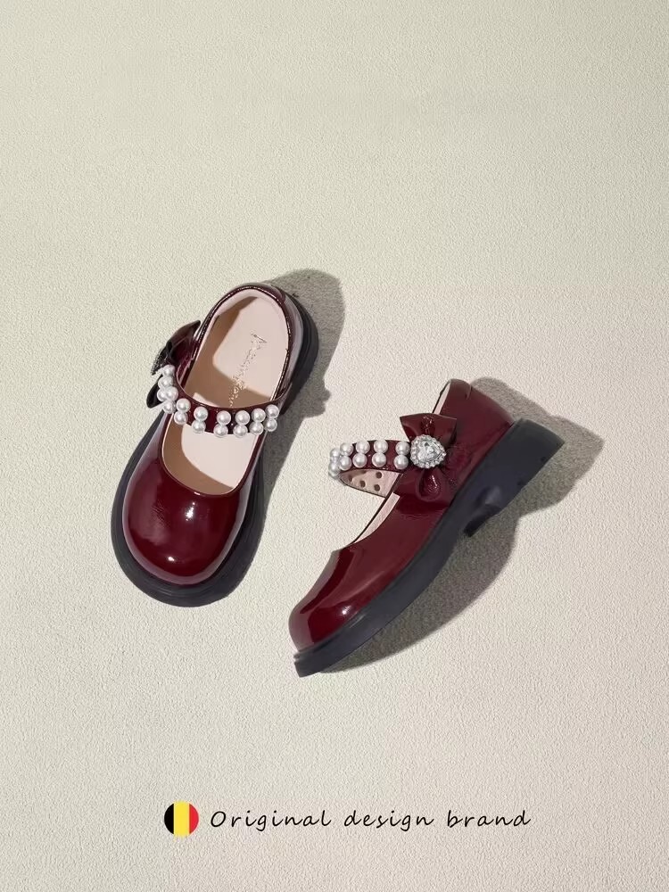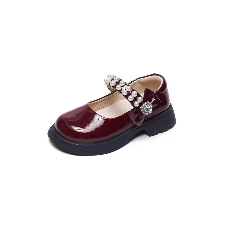 酒红色儿童皮鞋女童春秋季新款真皮珍珠吊坠软底学生单鞋演出舞蹈