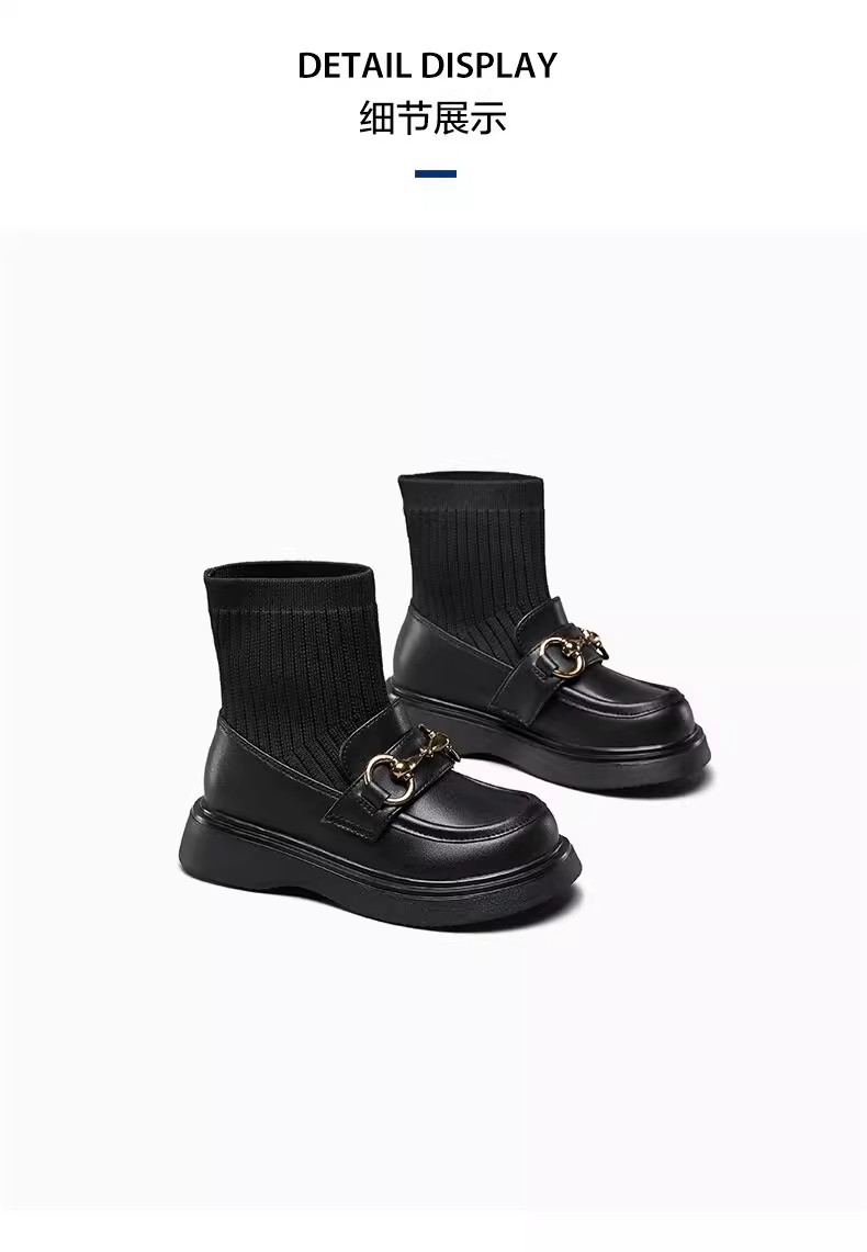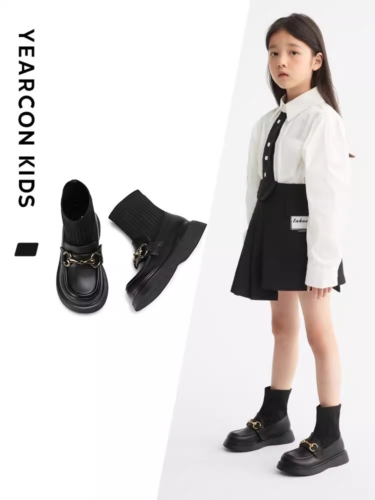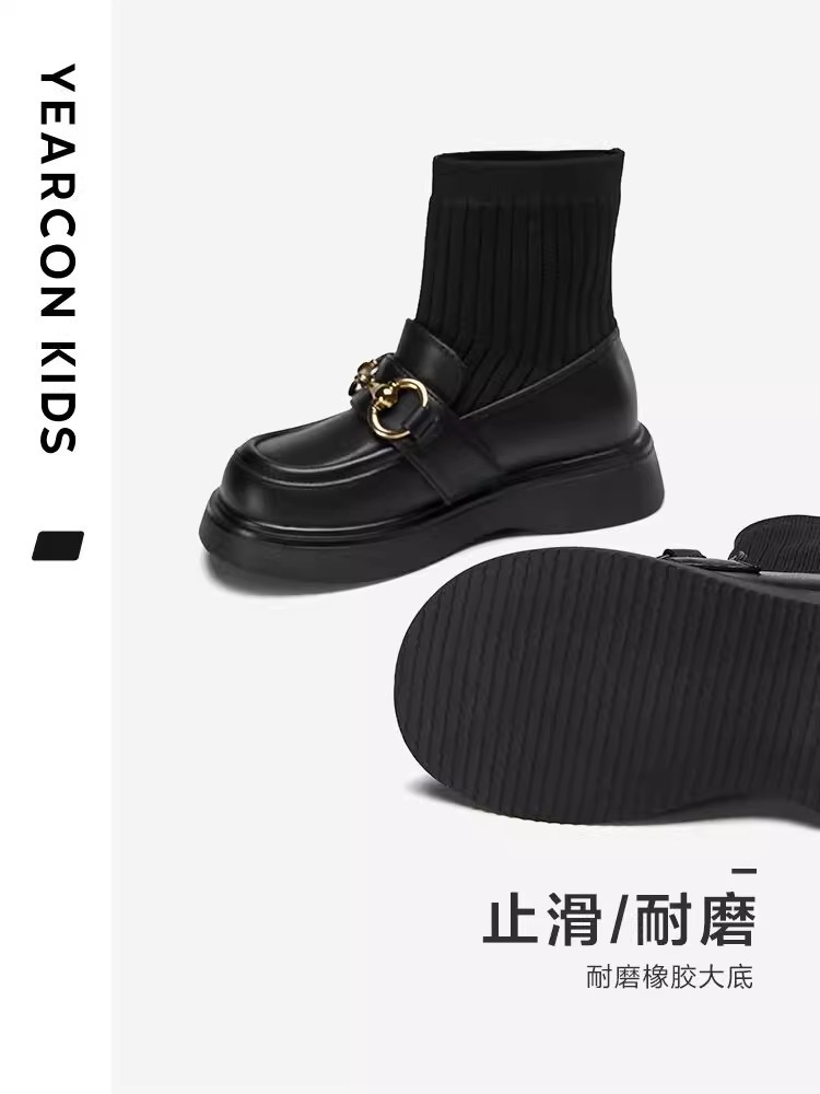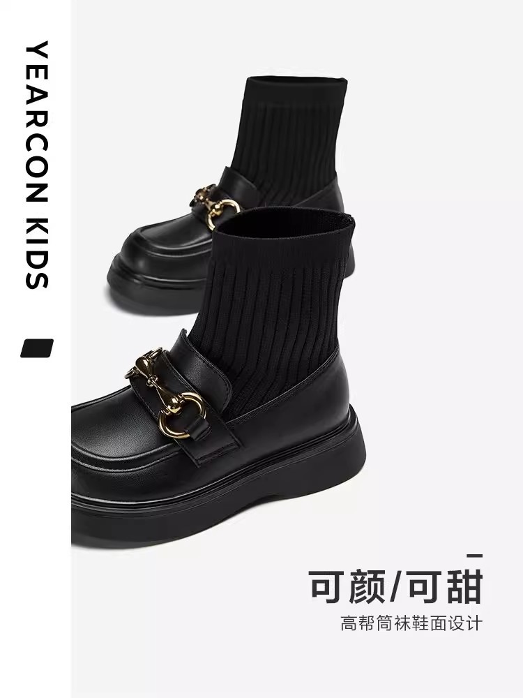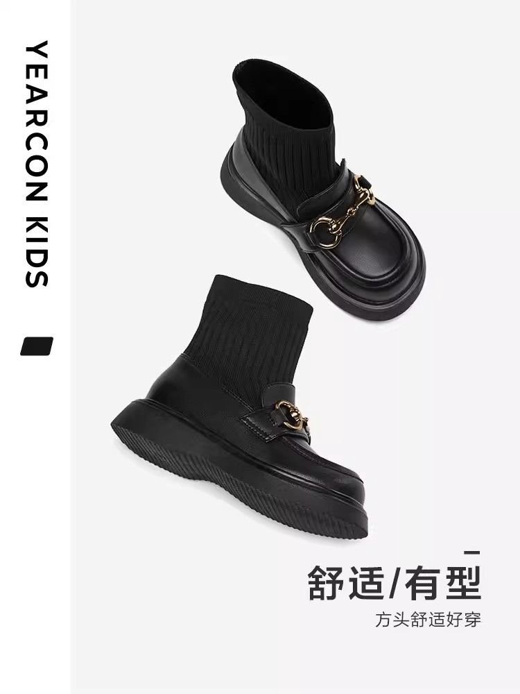 女童真皮2025秋冬新款中大童儿童韩版黑色毛线口弹力袜短靴马丁靴