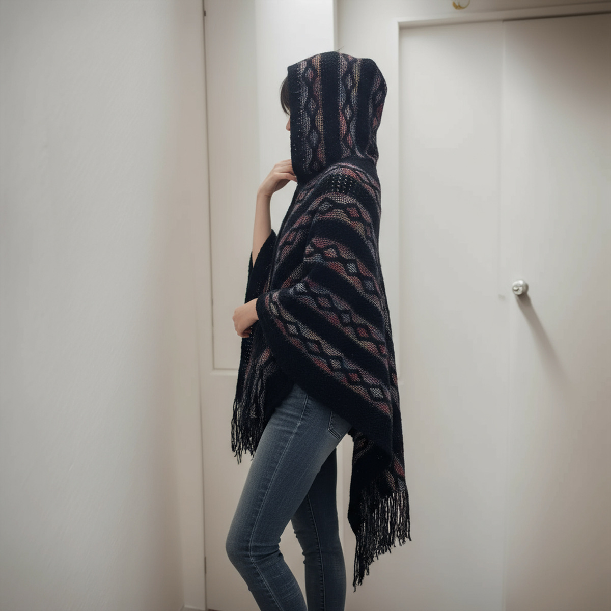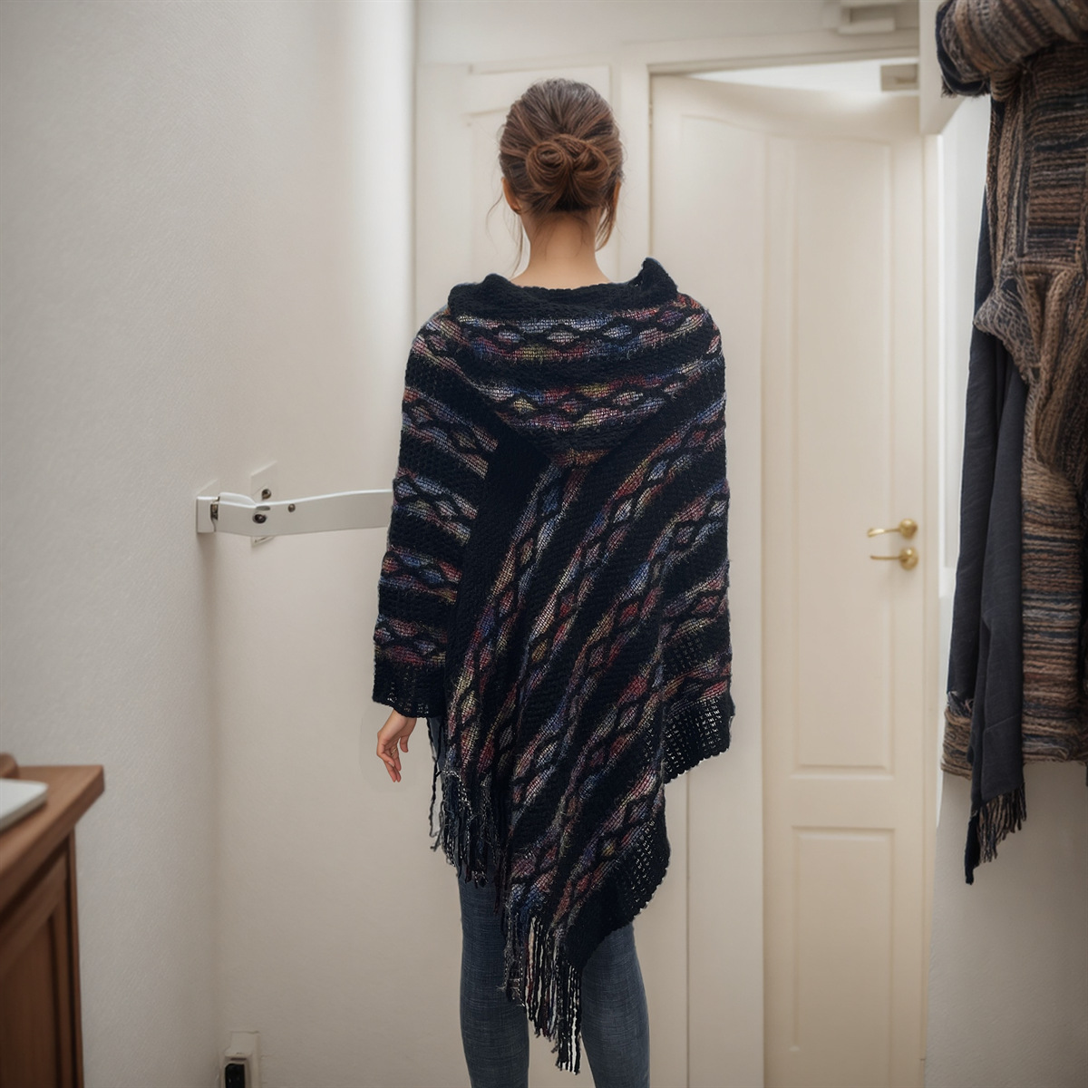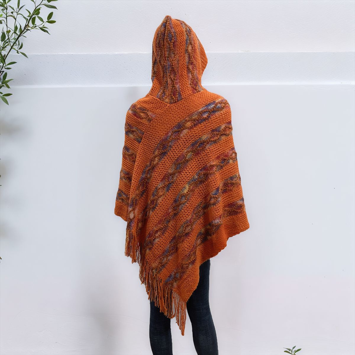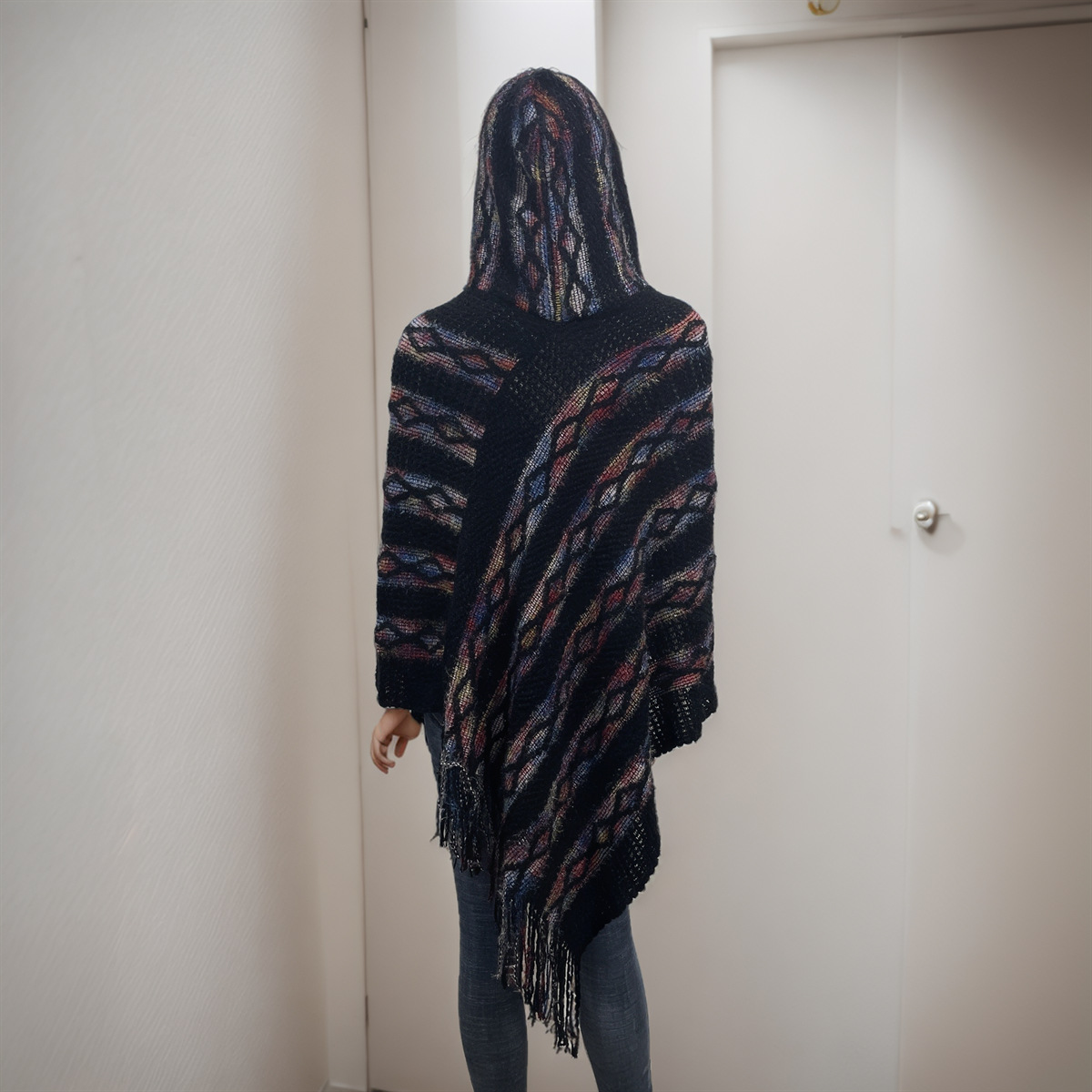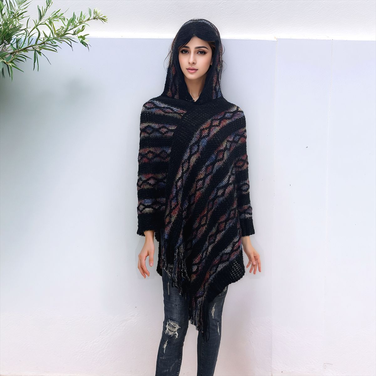 Choice 新款连帽提花流苏斗篷披肩女秋冬保暖外套彩色条纹宽松套头无袖衫